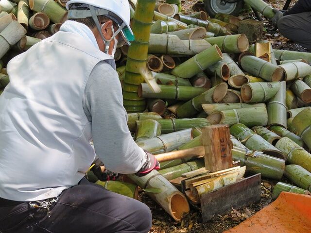 その後は竹灯籠を割り、チップ化処理後に竹林の林床へ戻りました。