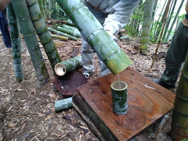 集合から進行を早めてタケノコ掘り、竹お椀つくりをしてスタッフの作った味噌汁を注いで昼食となった。
