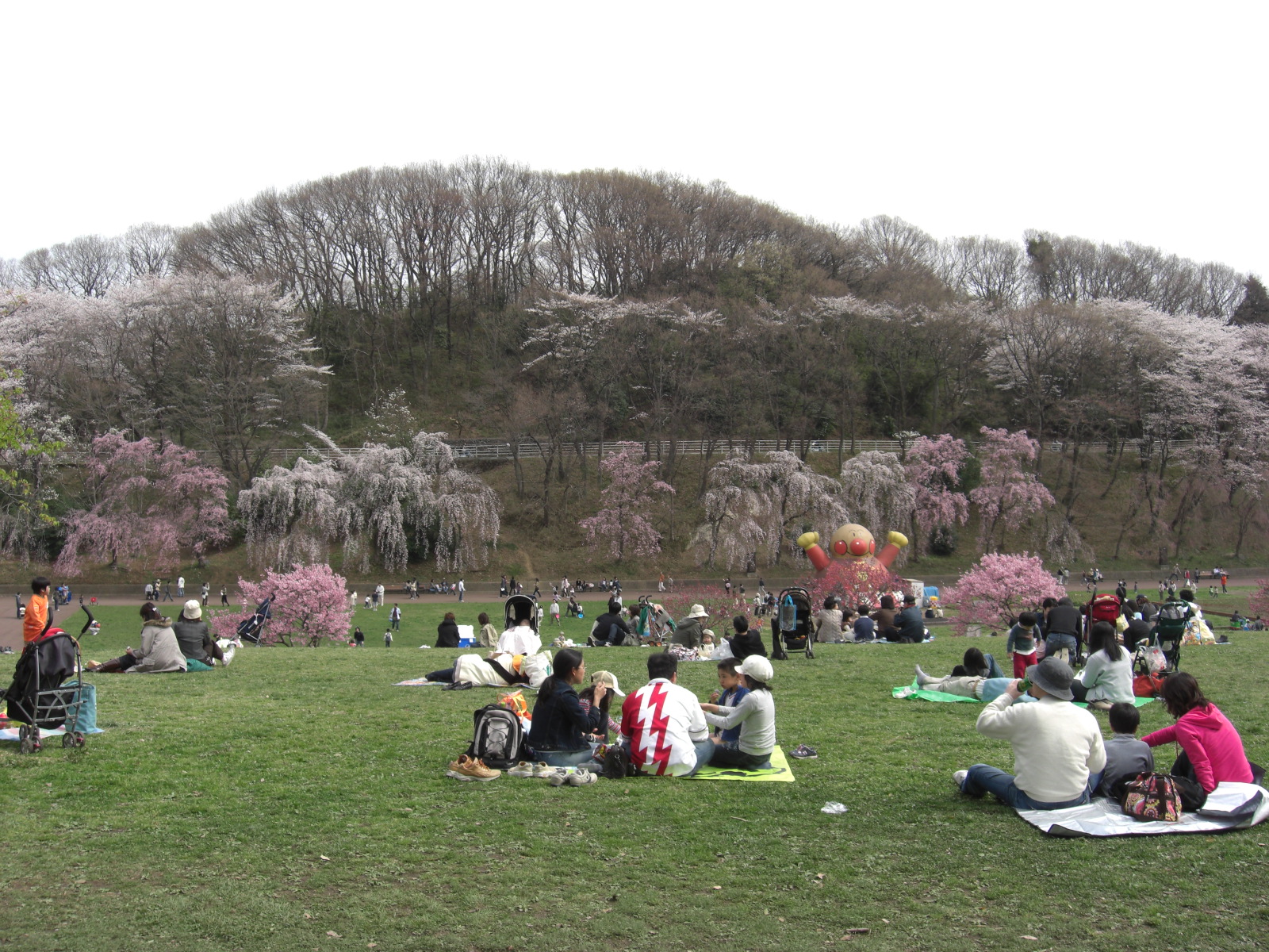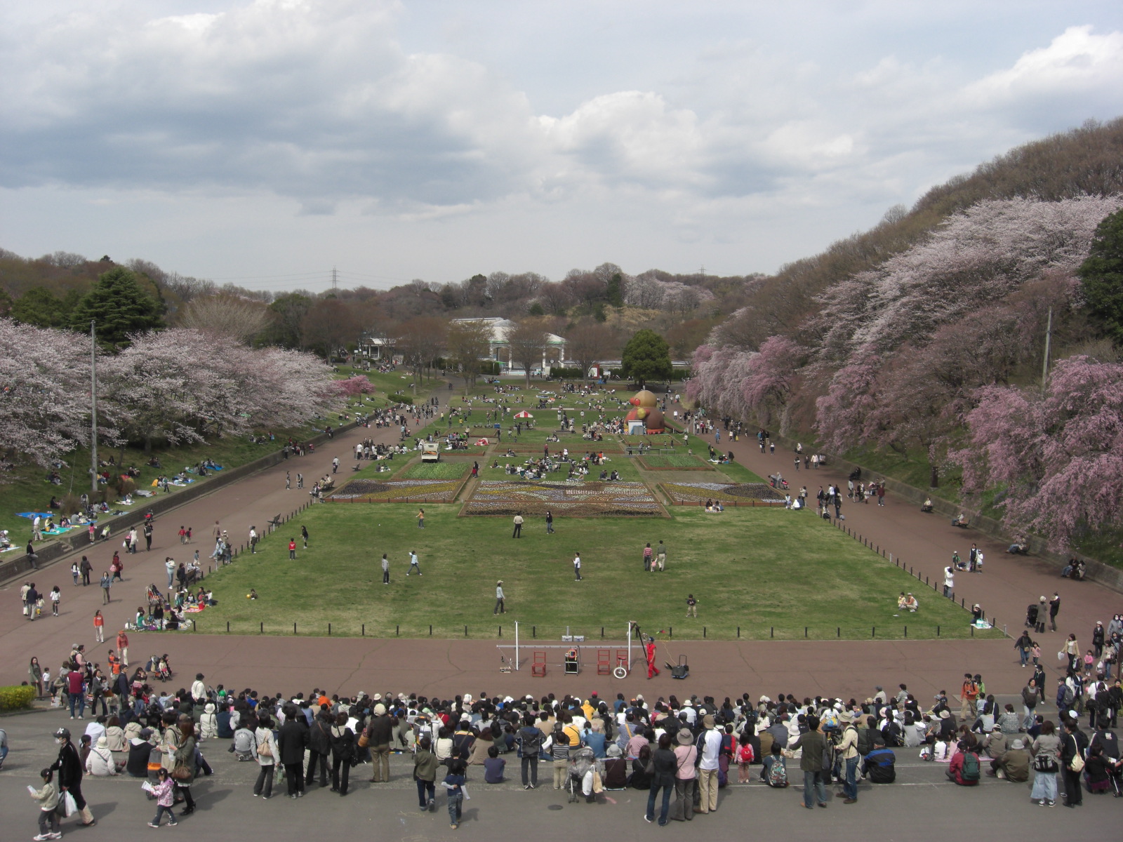 3,000本のソメイヨシノをはじめ5,000本のサクラが園内いたるところ満開状態、お客さんでごったがえした状況