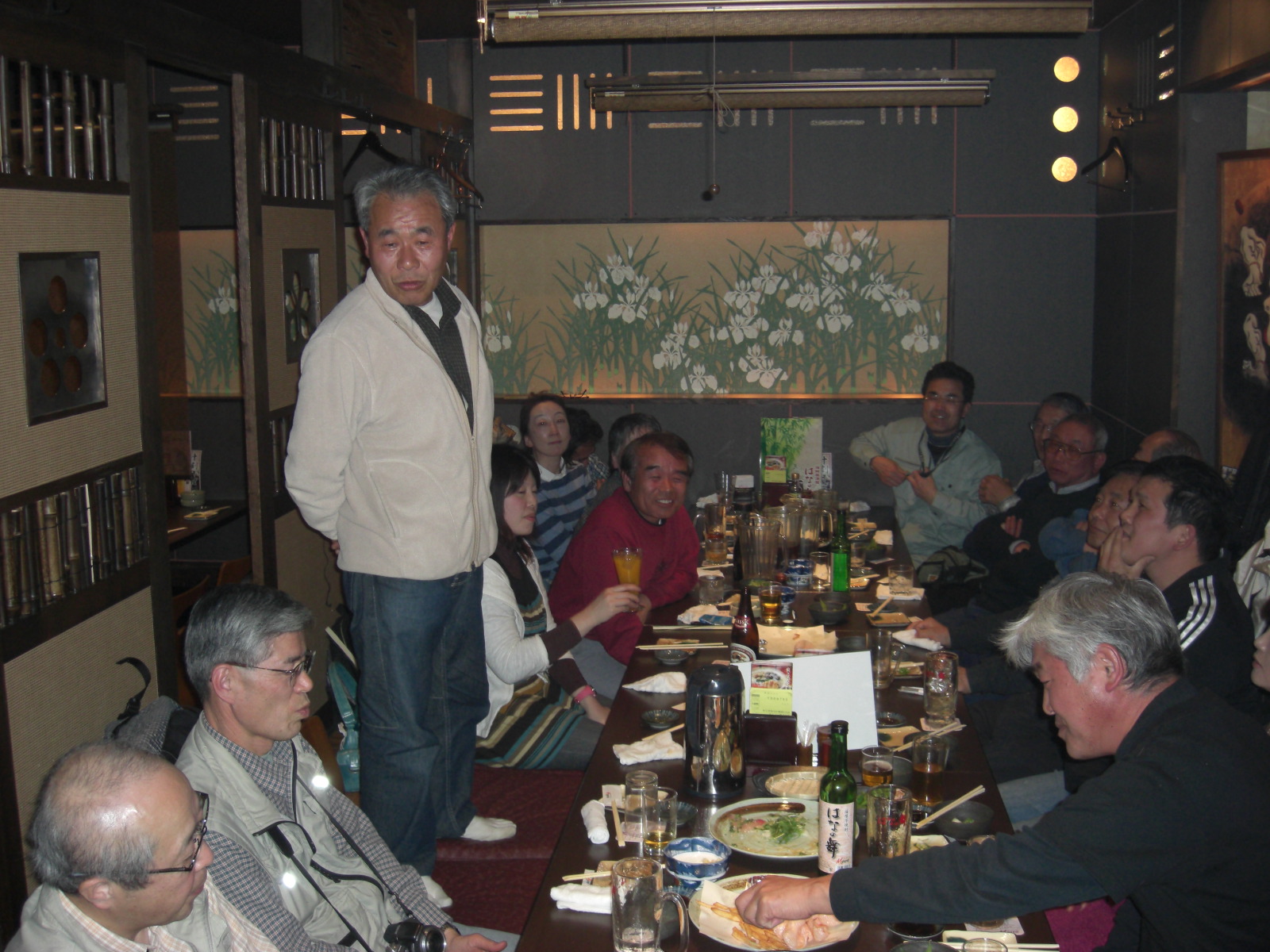 恒例の懇親会は毎度の会場、新横浜海鮮居酒屋 'はなの舞' に平石代表、「小机城址市民の森」松崎支部長とOBの方も参加して大盛り上がり