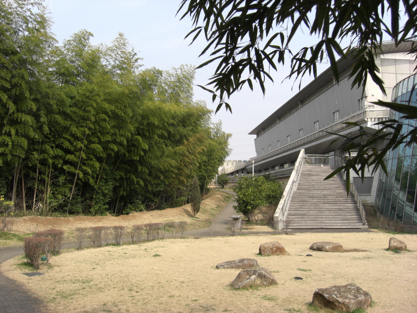 プールの西側はこの「林浴の庭」竹林と住宅をはさんで広い山田富士公園