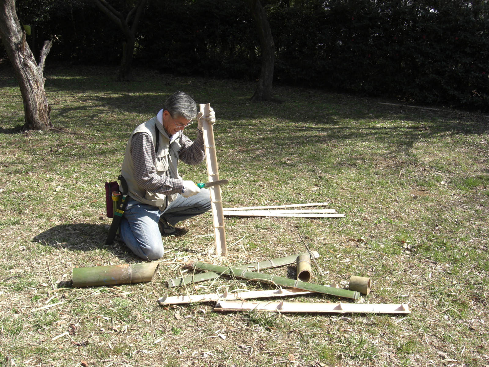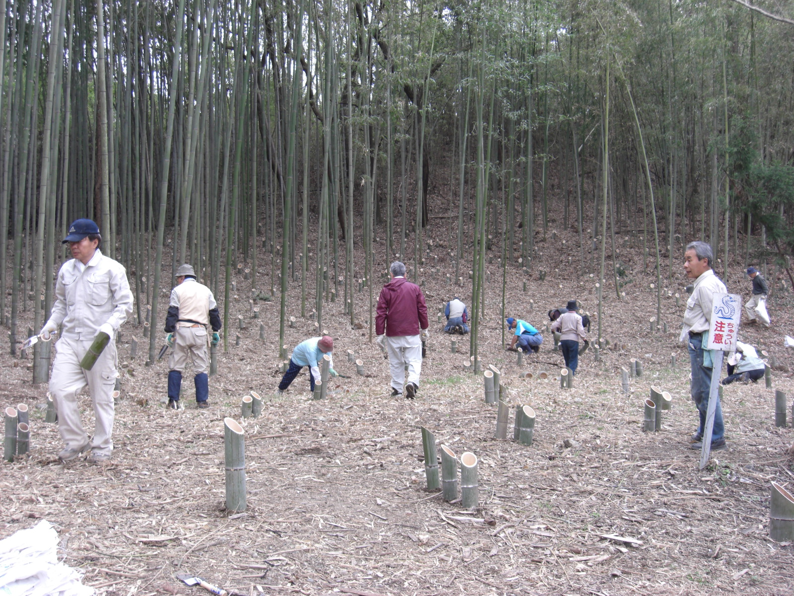 竹を切る時に各所のフィールドでは、参加者が腰ベルトにノコギリとナタを下げ、枯れ枝はらい用の短尺木と運搬用のロープを身に着けて竹林に入ります。