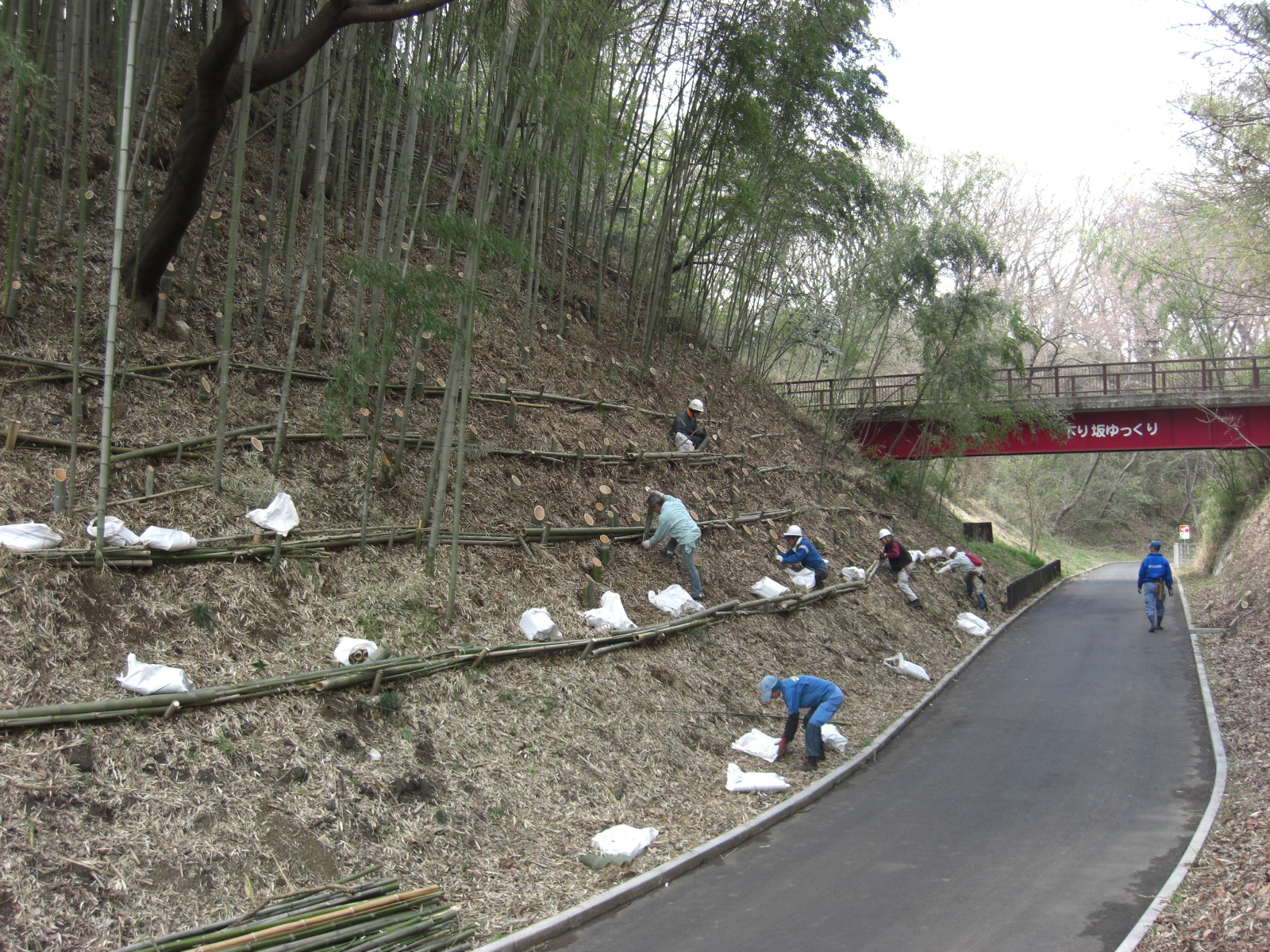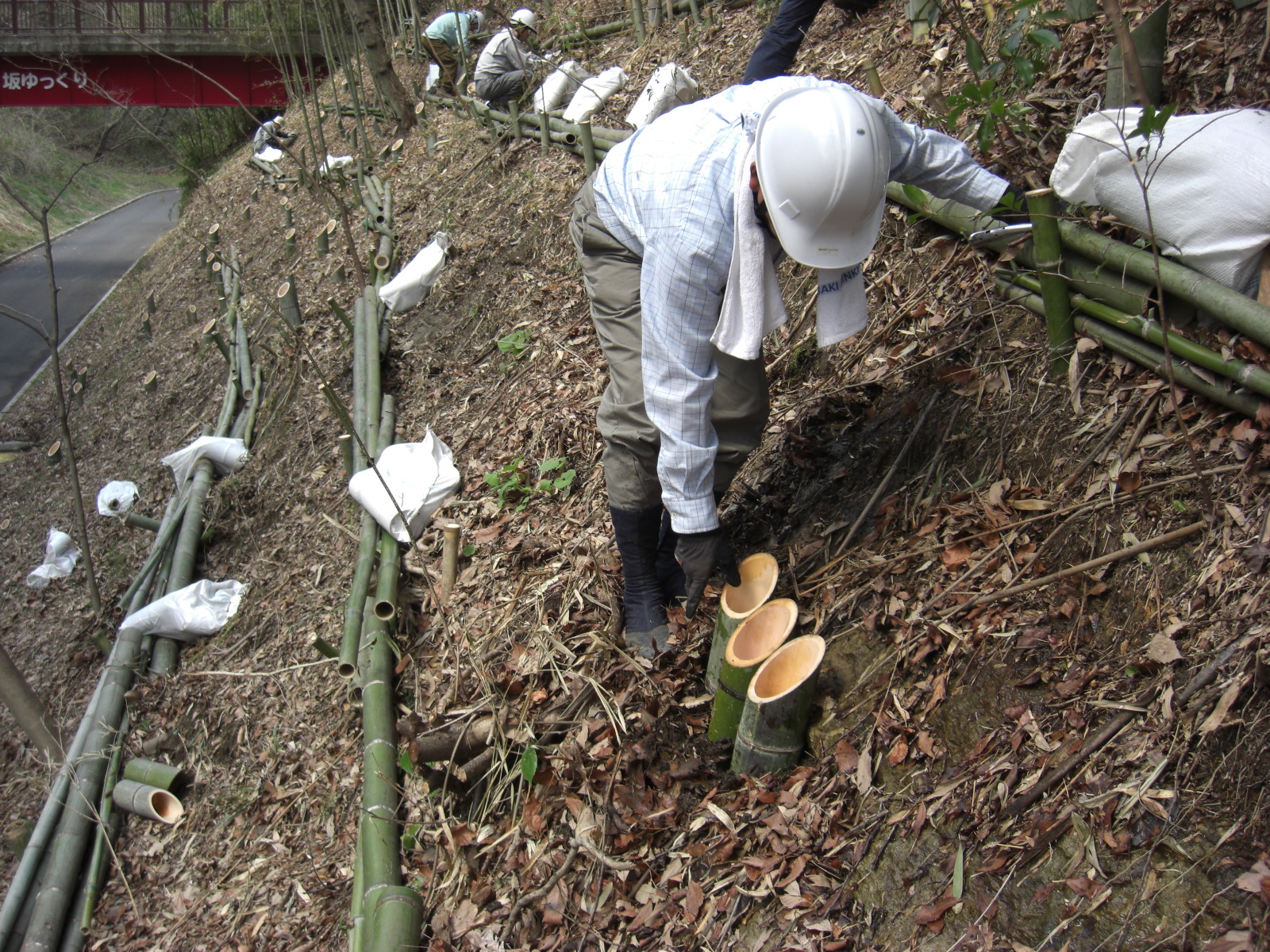 足場の悪いなか、こどもの国の職員の方が事前に水平足場を設置していたのと、土のう袋に入れた竹灯籠を配ってあったおかげで午前中に800個の設置をおわりました