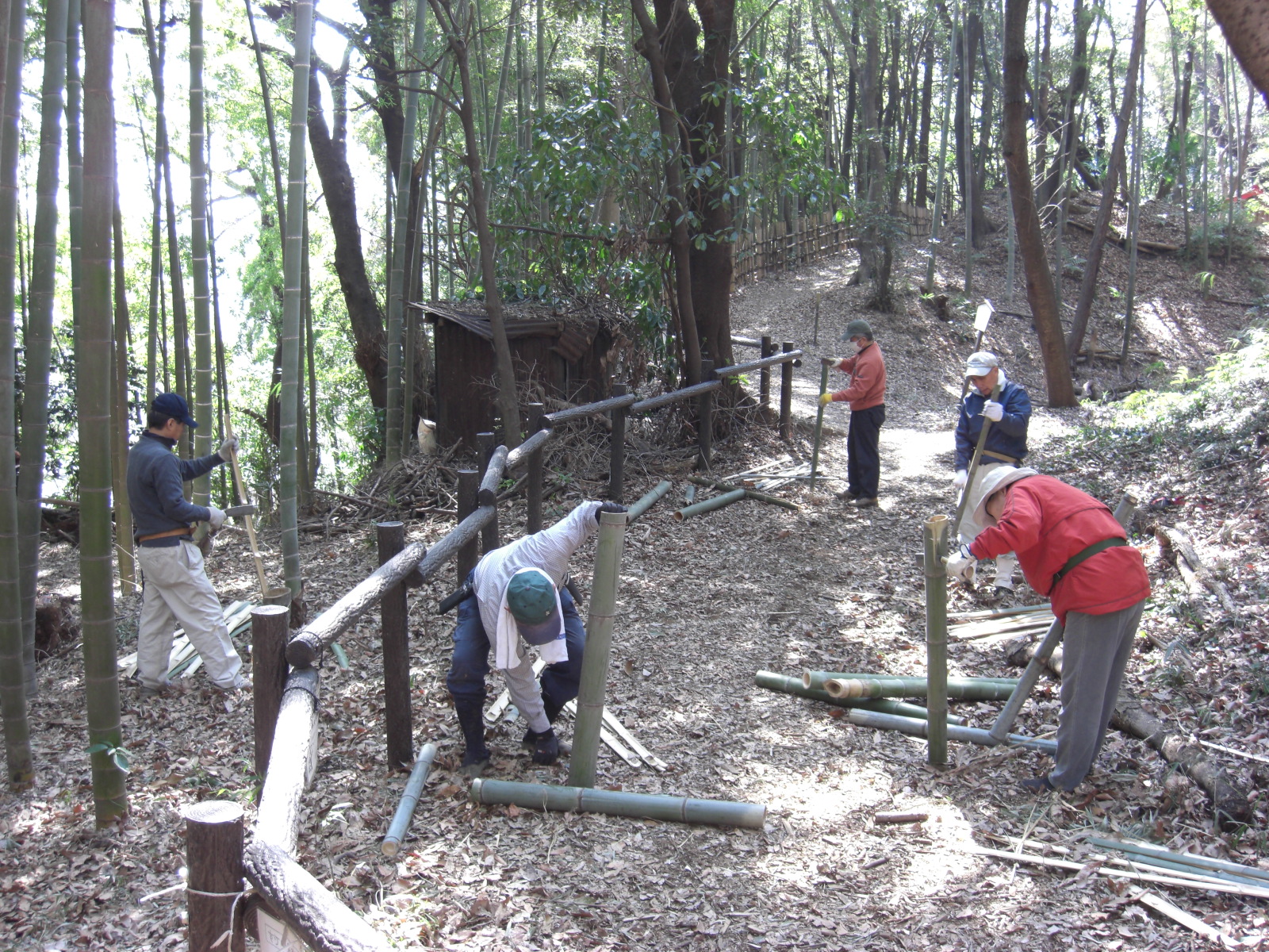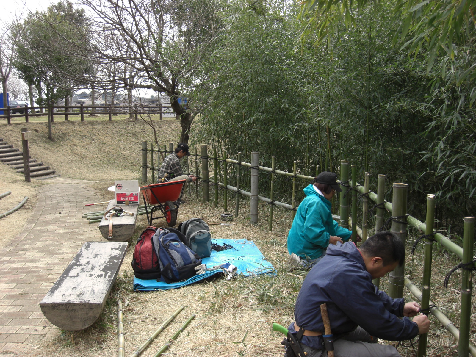 前回が雪のために「竹取協力隊」作業が中止となり、残った部分の四つ目垣設置です。