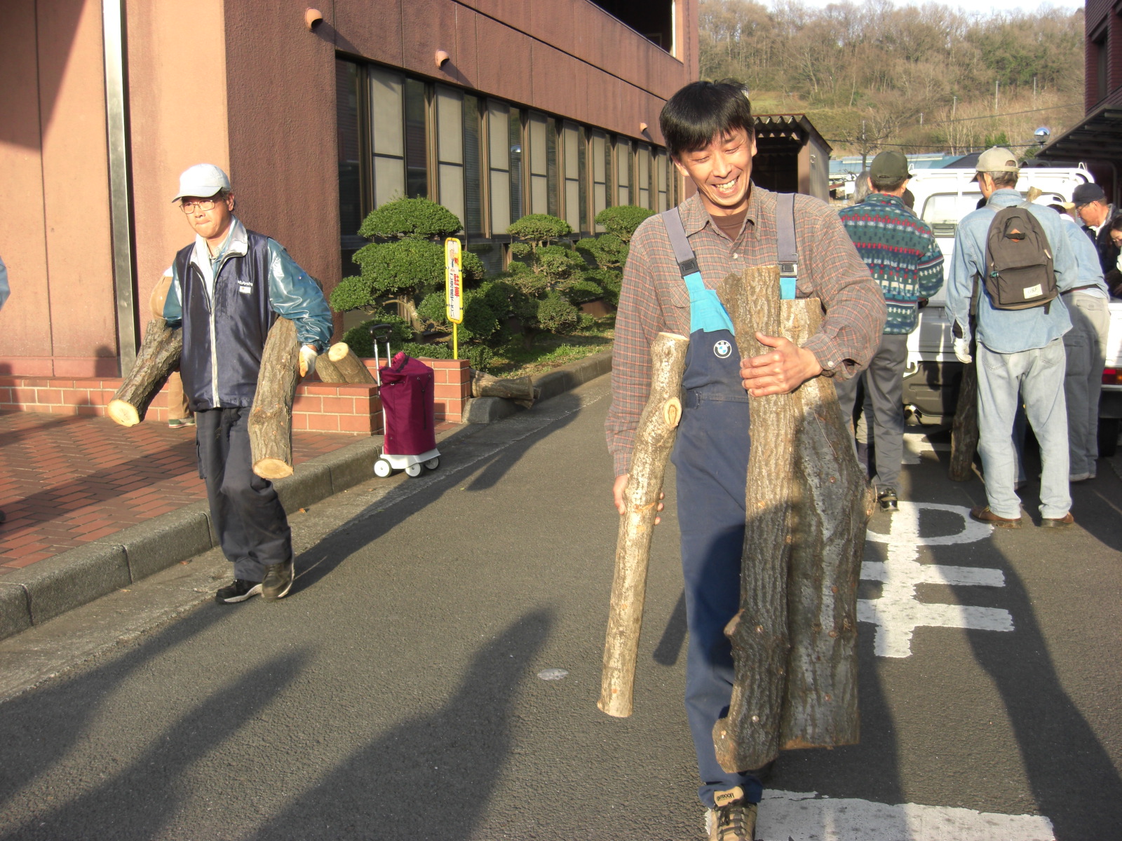 ホダ木ご購入の方ニコニコお持ち帰り、クヌギ、コナラはおもい、1年後をお楽しみに