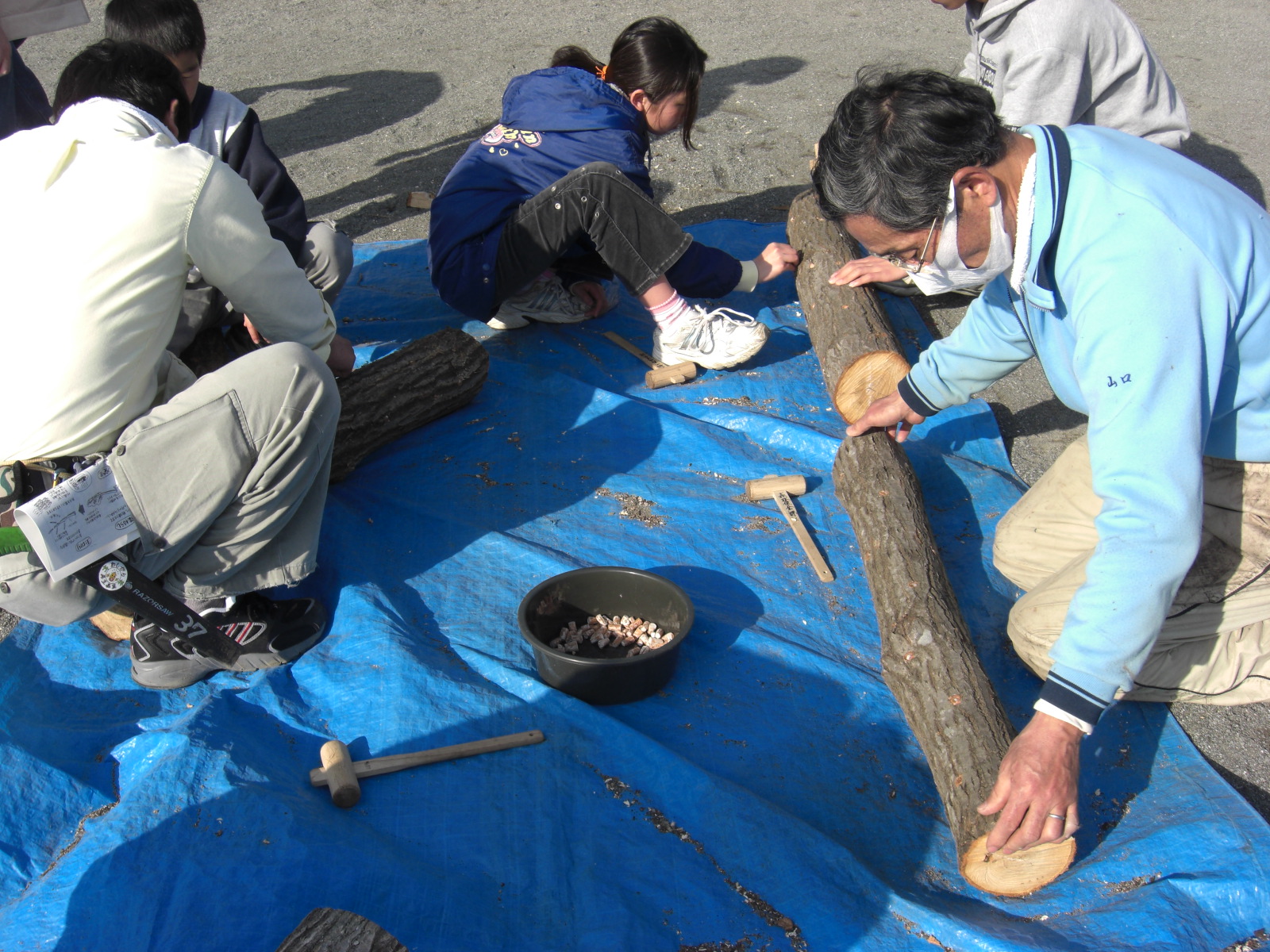ブルーシートの上で雑菌が入らぬように丁寧に種菌を木槌で打込み