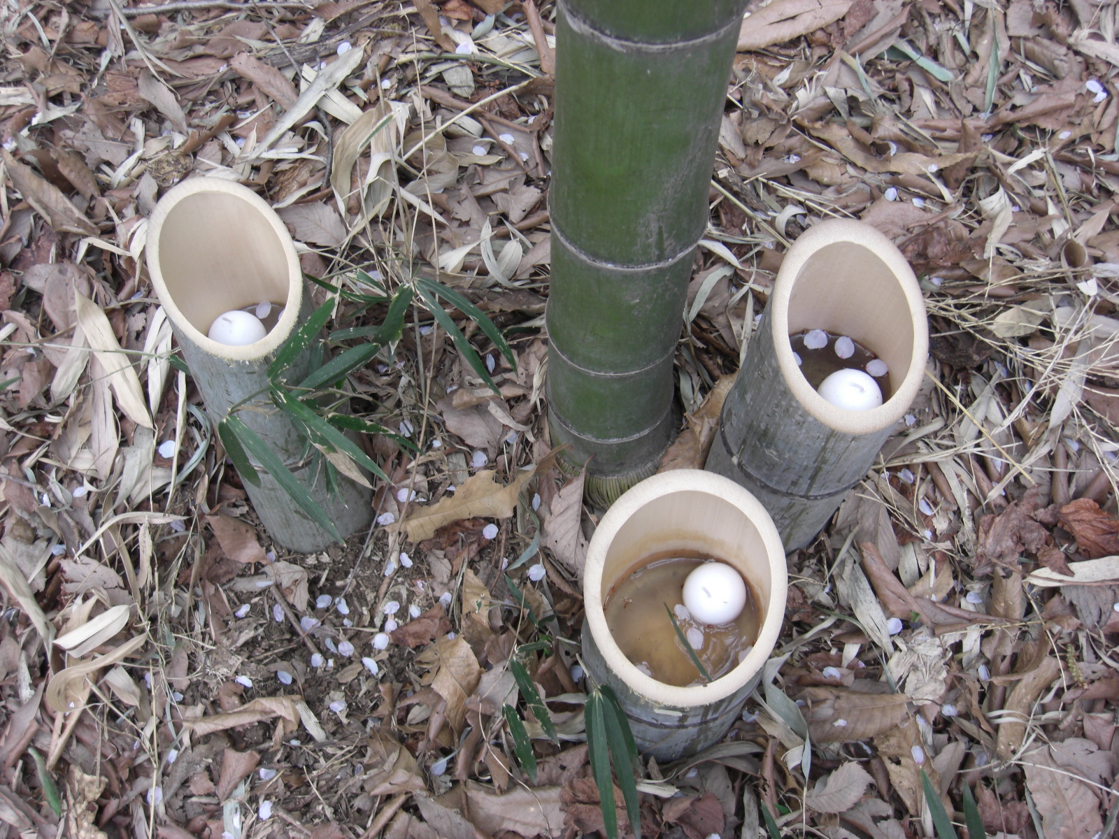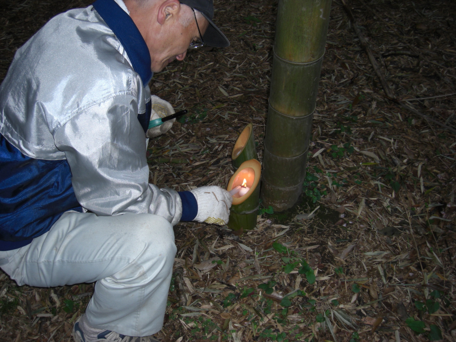 竹林内で竹灯籠を設置するには、水を注入してロウソクを浮かべます。