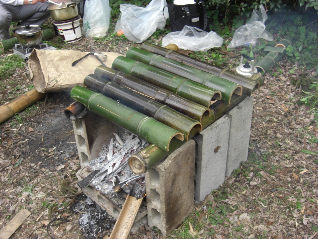 それは目一杯けむりを出して焼く豪快なサンマ炭火焼き、竹筒のかっぽ酒、甘酒、ゆず茶、たけのこの味噌汁、たけのこの大名焼き、焼き鳥、竹釜ごはん・・・etc。