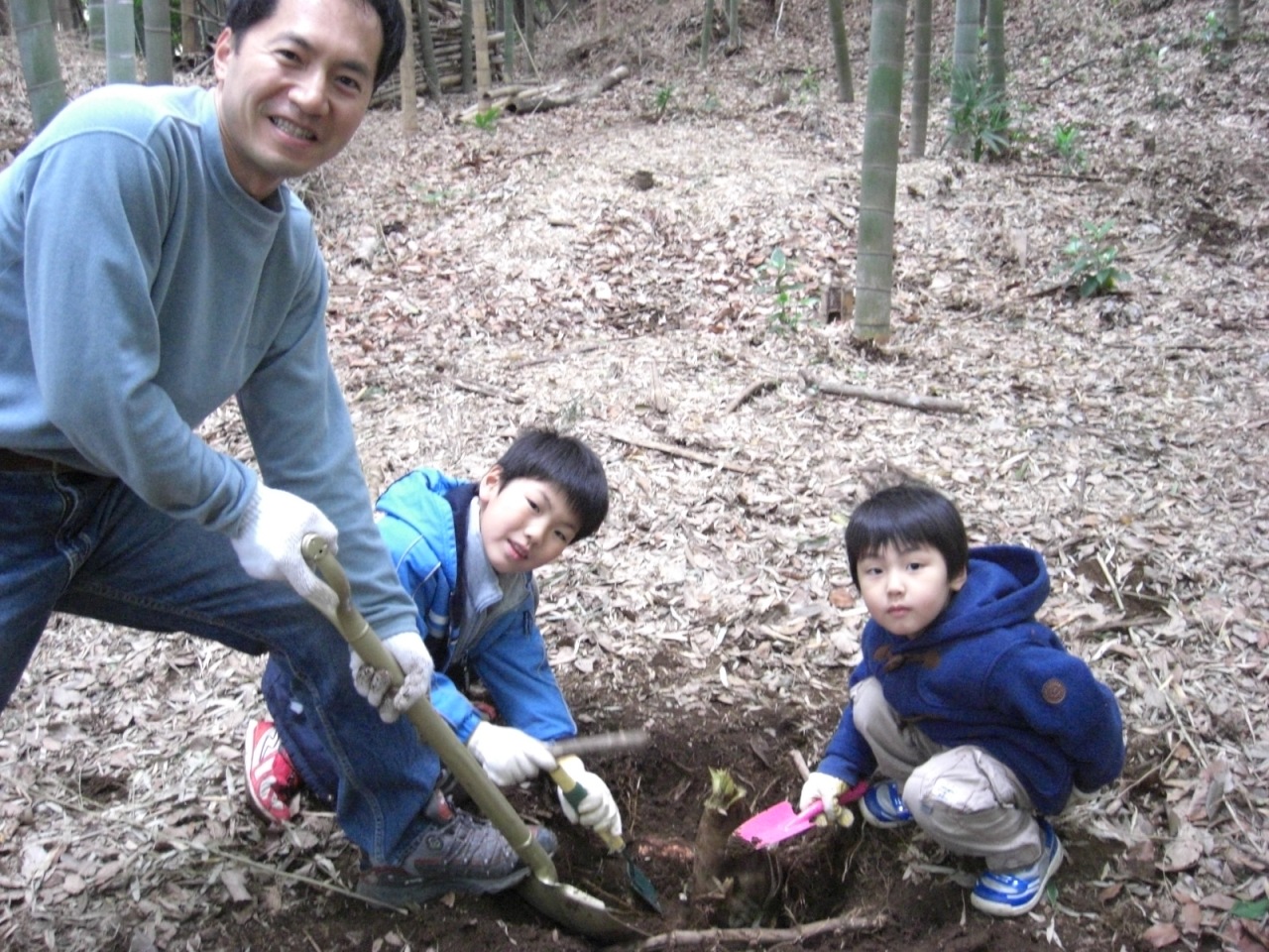 パパはご自宅から大きなスコップ、子供さんは園芸用のシャベルを持参したりで、たけのこ掘りに挑戦。