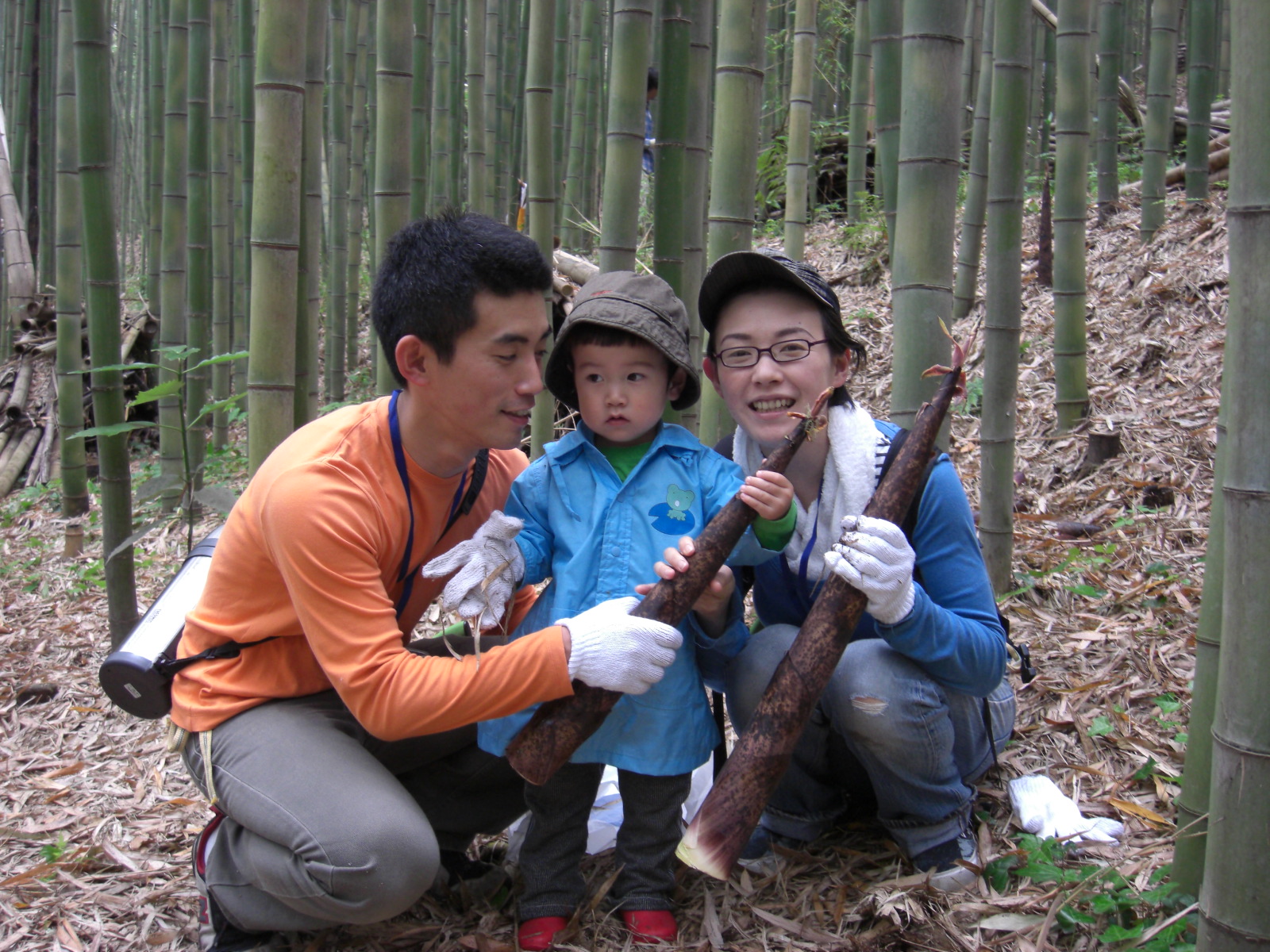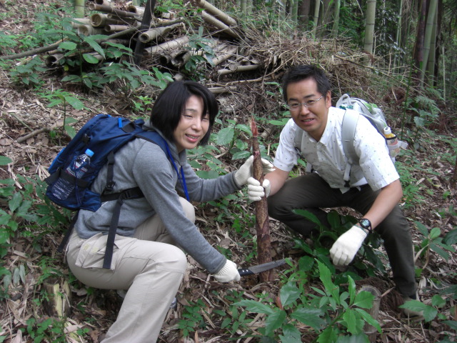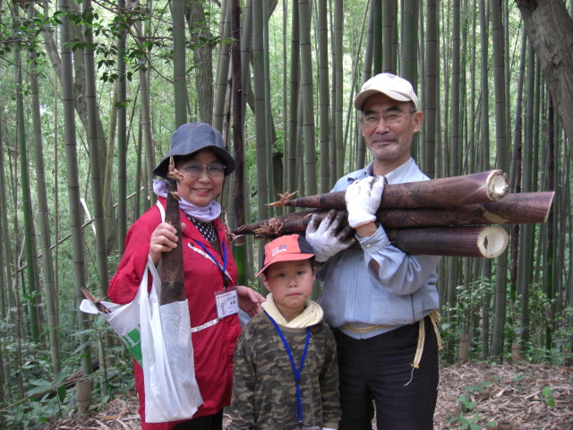 長いものを地表面で切り取る兄妹、小さくても素手でふかふかの腐葉土を少し取り除いた下で切り取るひと、モウソウチクと違ってスコップを使わずに汗もかかず、ノコギリだけで簡単に楽しめます