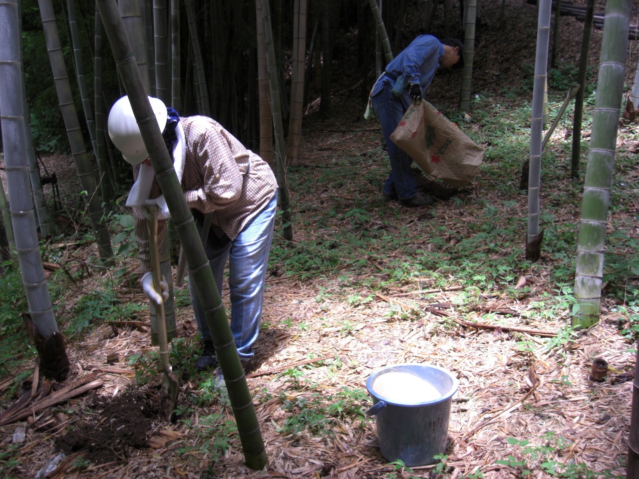 作業はモウソウチクエリアにお礼肥の米糠90kgを埋め、その後化成肥料50kgを散布、4月にたくさんの筍を出してくれた竹林に感謝感謝。