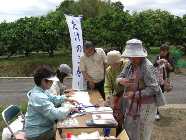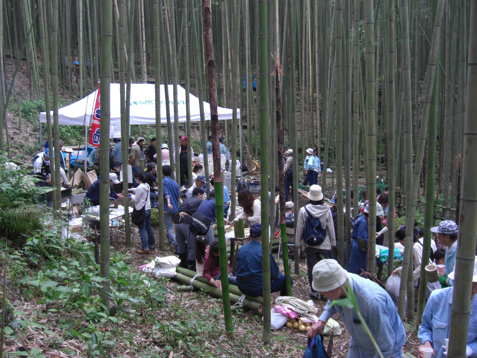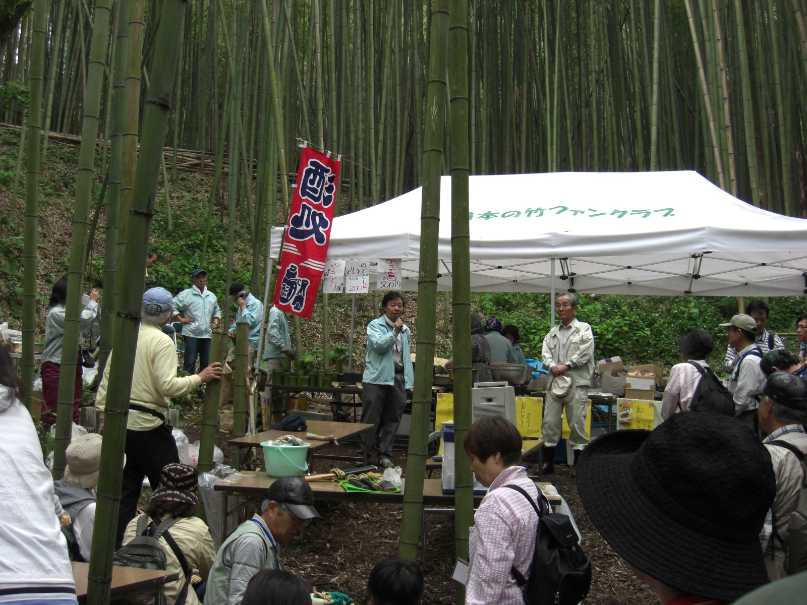よみがえりつつある美しい竹林を歩き、日本の竹文化を多くの方に知っていただくのと、産直マダケたけのこ狩りを楽しむ中井たけのこ祭りは、昨年までのたけのこ狩りに加え、今回は日本の竹ファンクラブが心を込めた料理、中井町の野菜等特産物販売、アトラクションでお客さまを迎えました