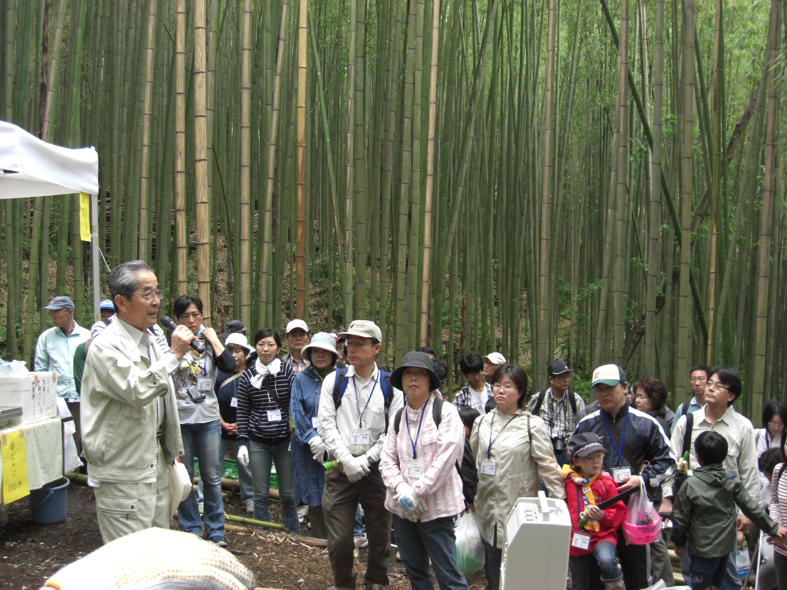 5月25日に厳島湿性公園で開かれた竹灯篭の夕べにつづいてのイベント、1日目の8日は6エリアに分かれた、たけのこ狩りが尾上中井町町長と平石代表の挨拶後に始まりました