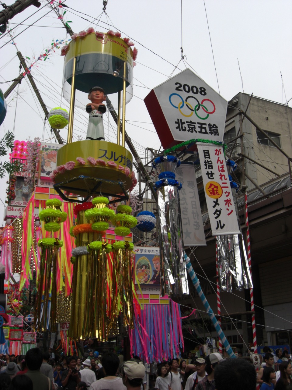 途中のメインストリート銀座通りは15m以上ある竹ざおに、巨大な竹飾りが吊られて太い竹ざおには重みに負けないように、これまた補強用の太い丸太がしっかりと添えられてます
