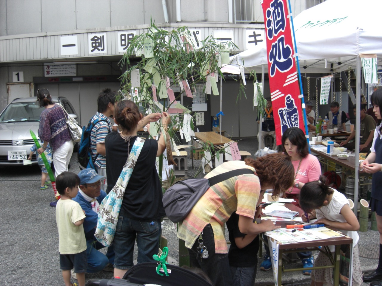 短冊に願い事を書いて、竹笹に吊るす情緒ある七夕風景の店先はのどかです
