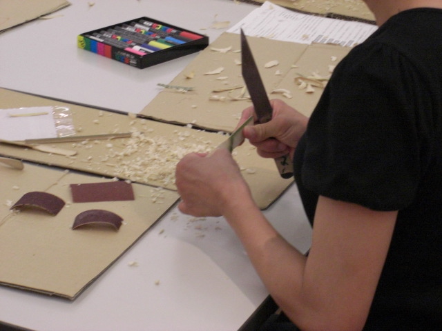 大人は一生懸命にナイフで削り、サンドペーパーで磨きます