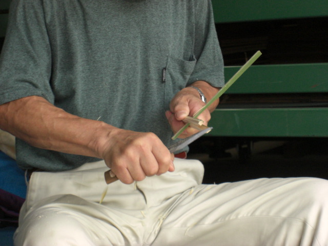 ということで今回のとんぼ、大人は伝統の切り出しナイフで削り出す竹とんぼ、竹串もつくります
