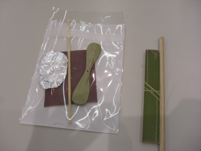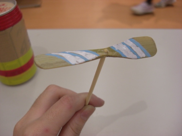 お子さんは軽い磨きが済むと、羽根のバランスを見てあげ、ロウソクの熱でひねりを加えてて竹串を接着剤で固定、あとは色仕上げをします