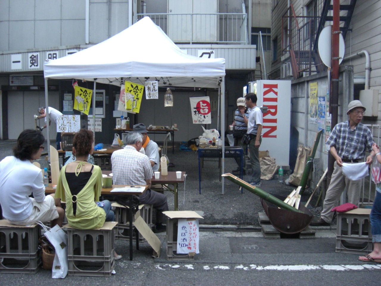 市川商事さんにご用意願ったテーブルと逆さビールケースのイスは、特製の段ボールマット敷きで下町風レトロタップリ