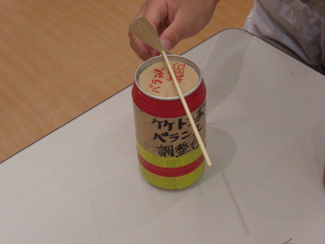 特製バランス調整台1(ビール缶)に次から次へと持ち込まれる羽根は、イロイロ