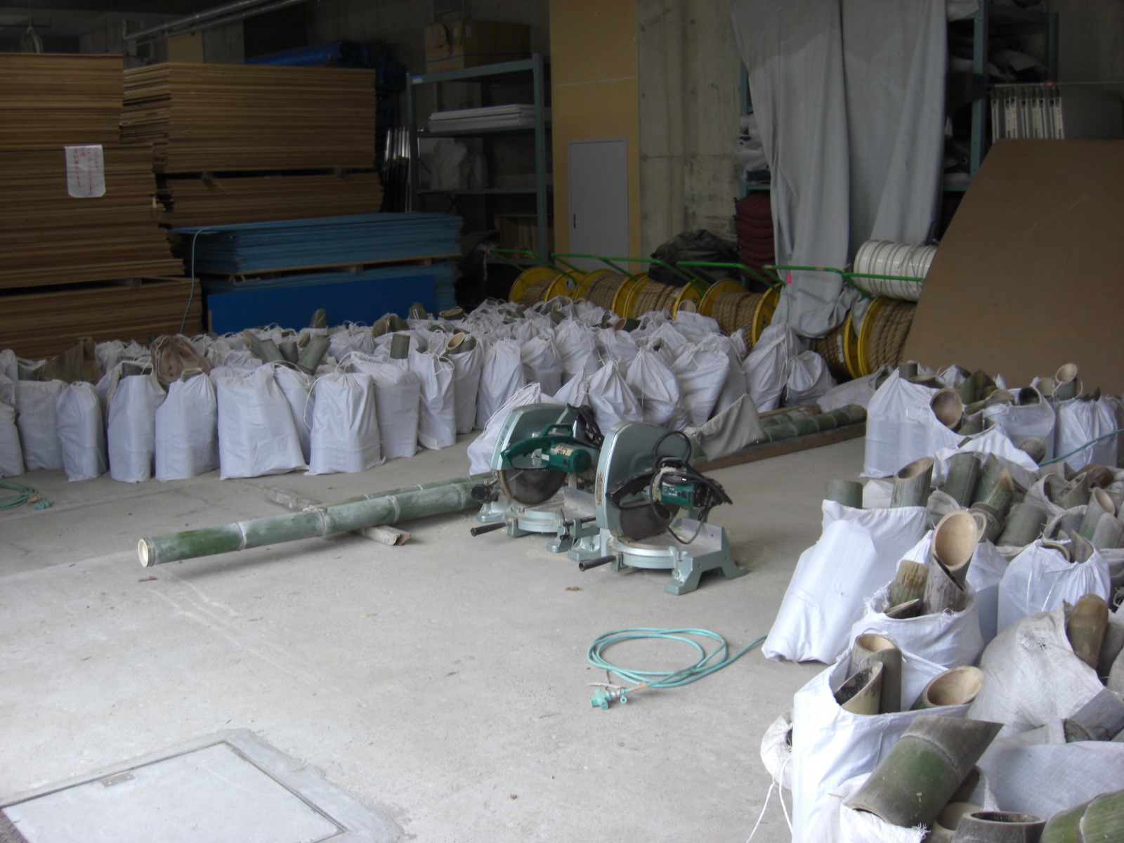 大型の丸ノコは小机城址市民の森から2台、中井町半分形のフィールドからの1台が持ち込まれ、横浜国際プールの1台とあわせて計4台がうなりをあげ、あとはまつり用のかっぽ酒筒、竹皿等の加工につかいます。