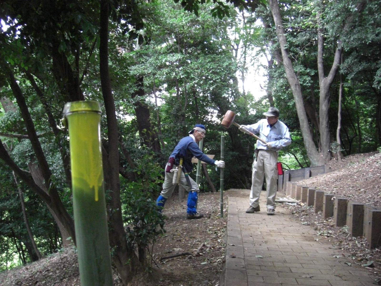 竹灯籠の設置 見学路安全柵支柱の打込み