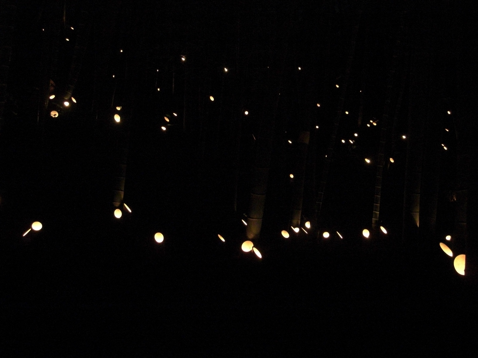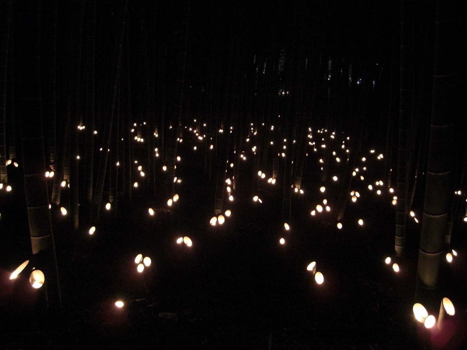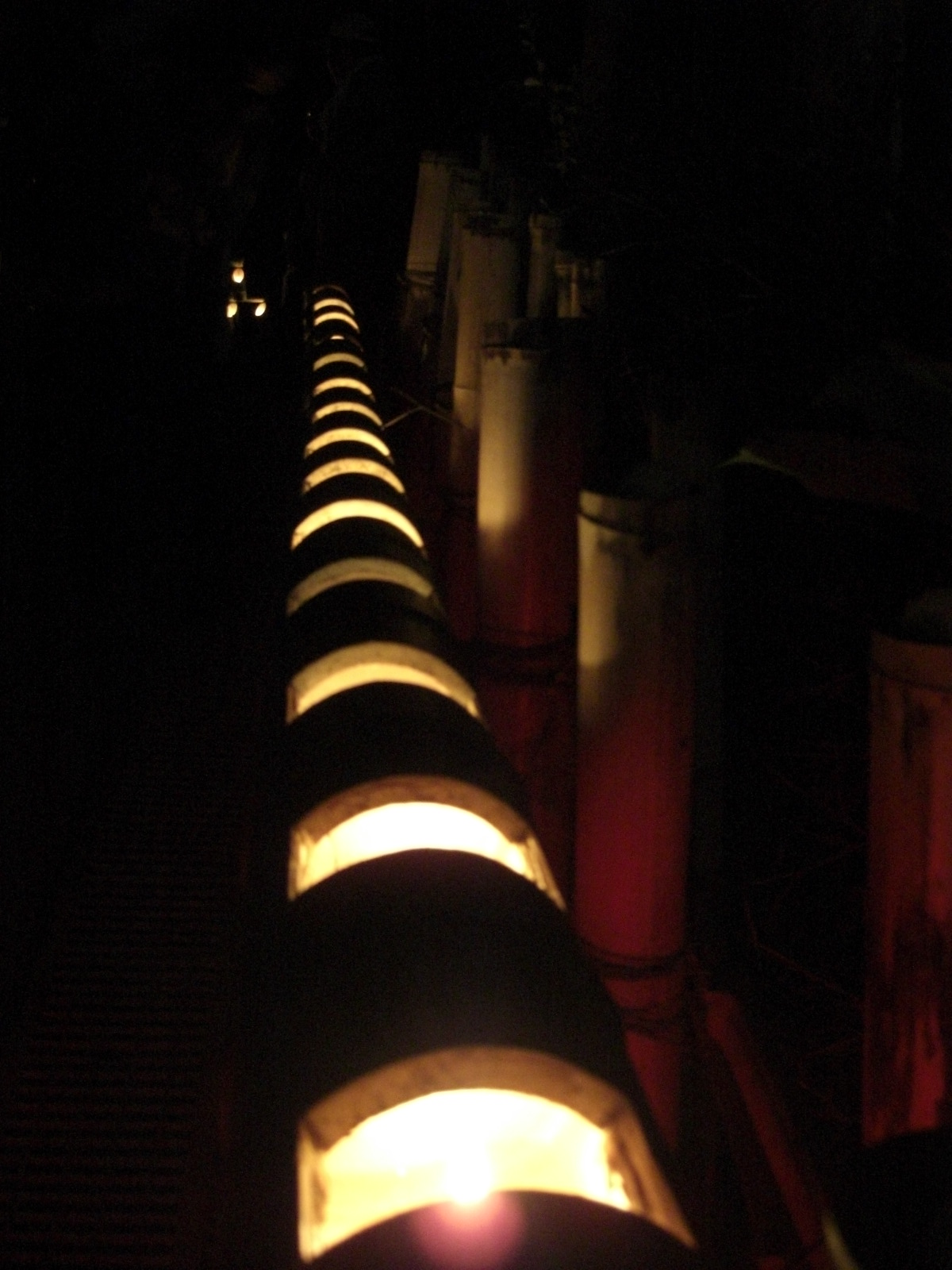 なだらかな階段を上がると左に奥深くまでの竹灯籠、正面に目を向けて少し目を上げるとロウソクの炎が竹灯籠内側に反射し、あたたかいおだやかな色が目に飛び込んできました。