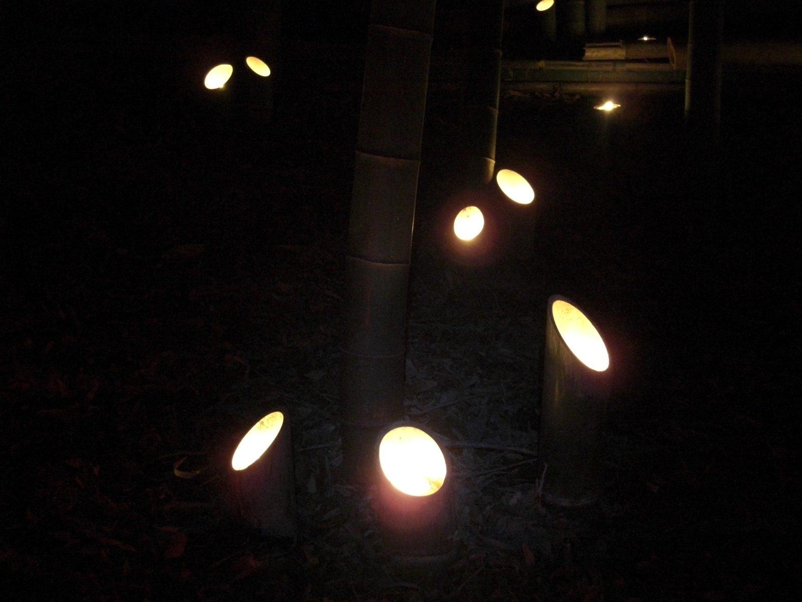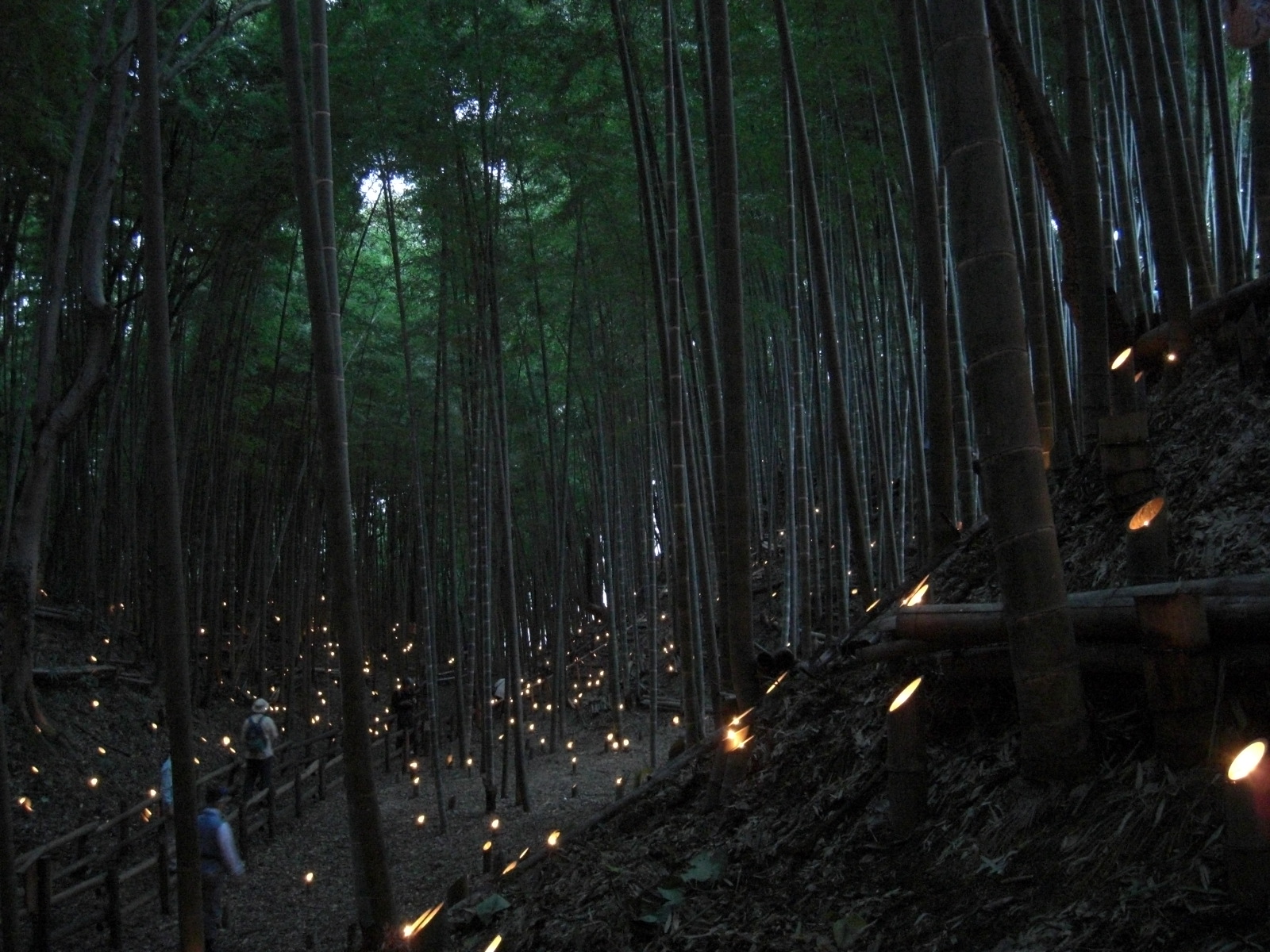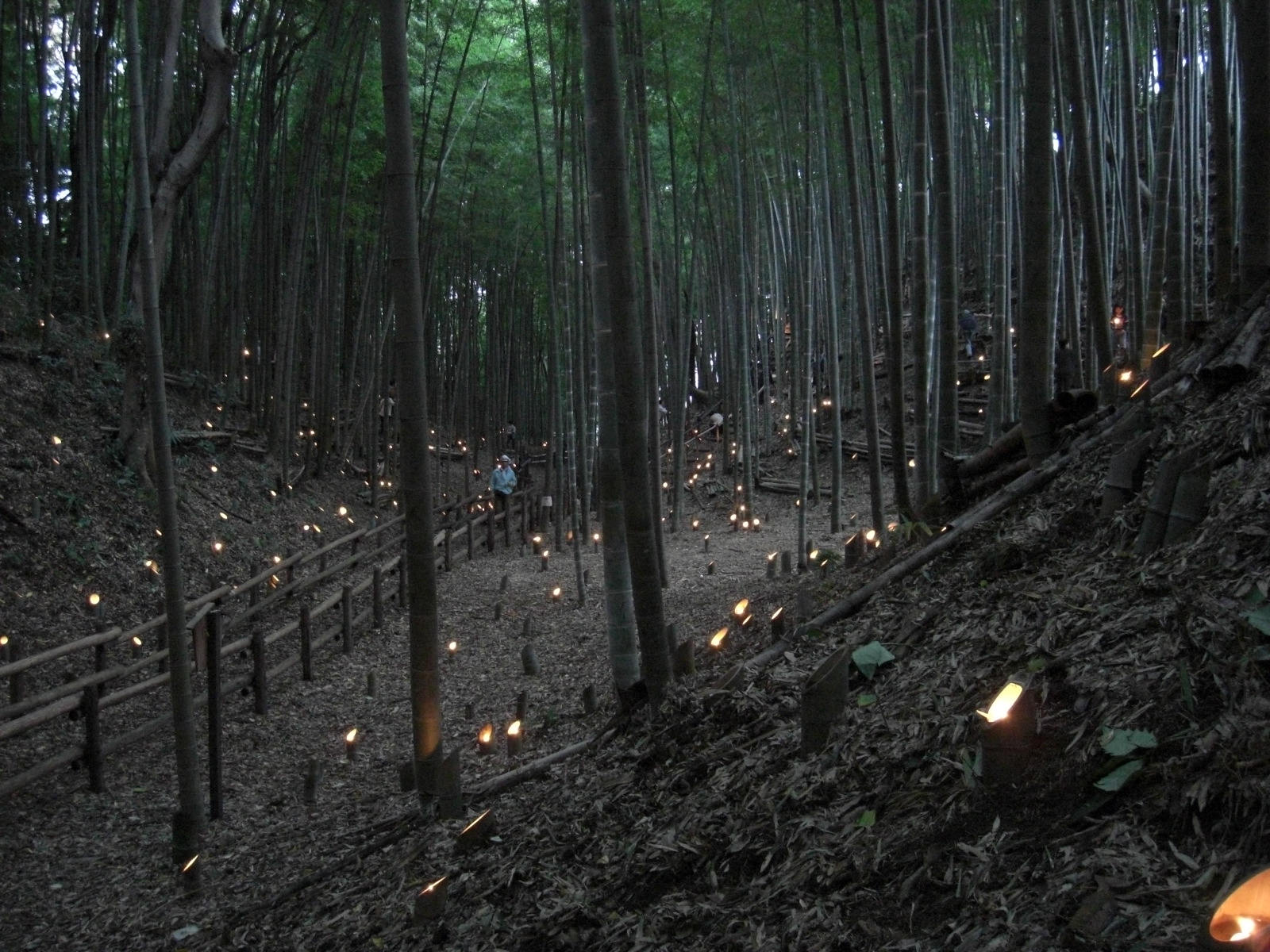 尾根伝いのように暗い静かな空掘の上を歩き、右手にこじんまりした平地竹林があります。少し目先を下に向けたここの竹灯籠も、人気スポットのひとつです。