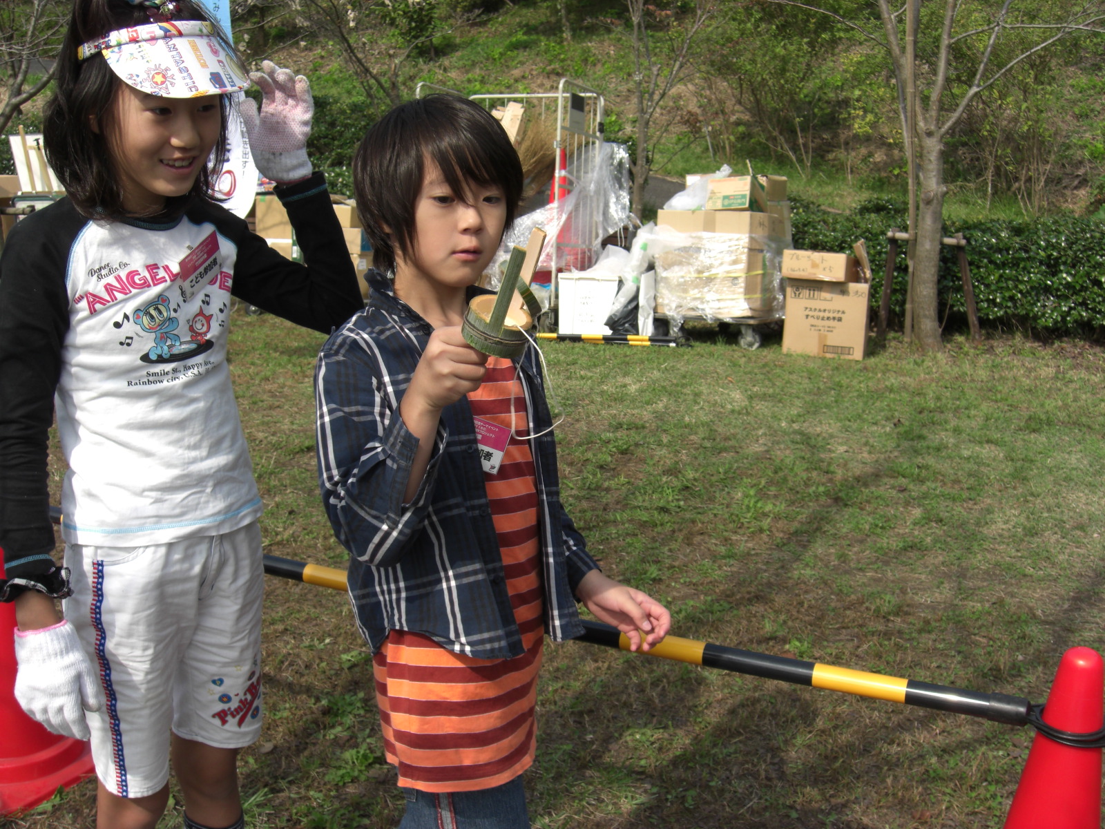 午後は中学生以下が朝から竹ぽっくり、竹けん玉などを作っていたのと一緒になり、全員で竹工作となりました。