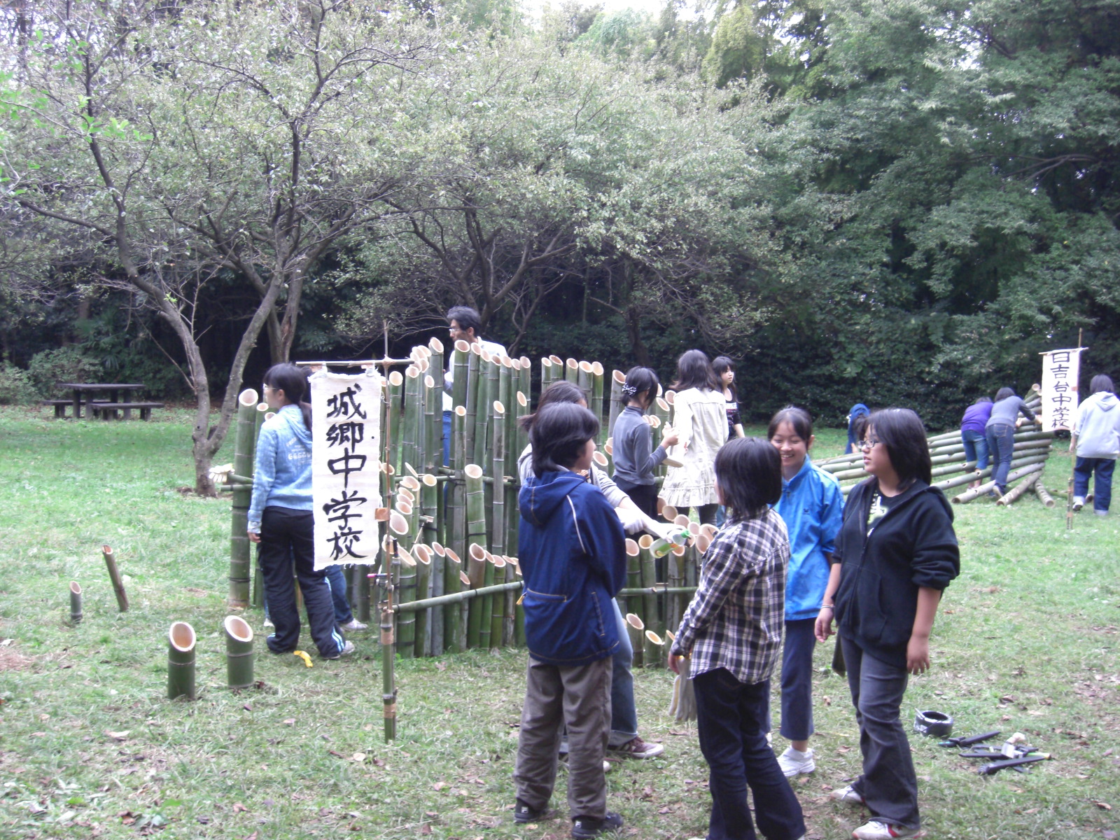 竹でプランター、徳利、お猪口、ビールカップ、皿、花瓶、ランプシェード等を工作して金沢自然公園での一日が終わりました。