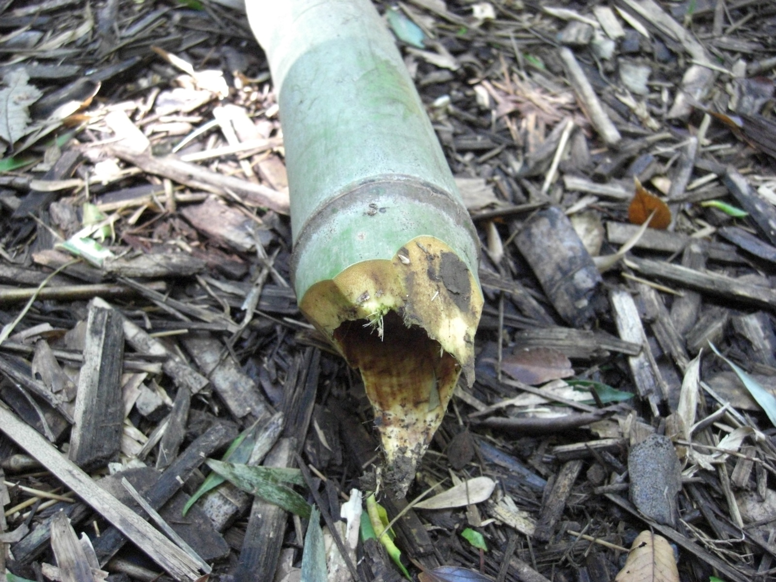 さてタケノコは10月中旬から冬にかけて出始めて、越年して春暖かくなってから葉が開くようですが、すでに伸びたものは小さな葉がついてます。
