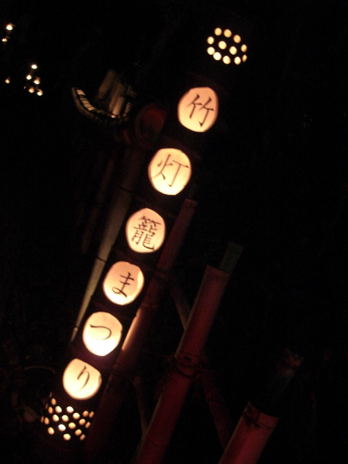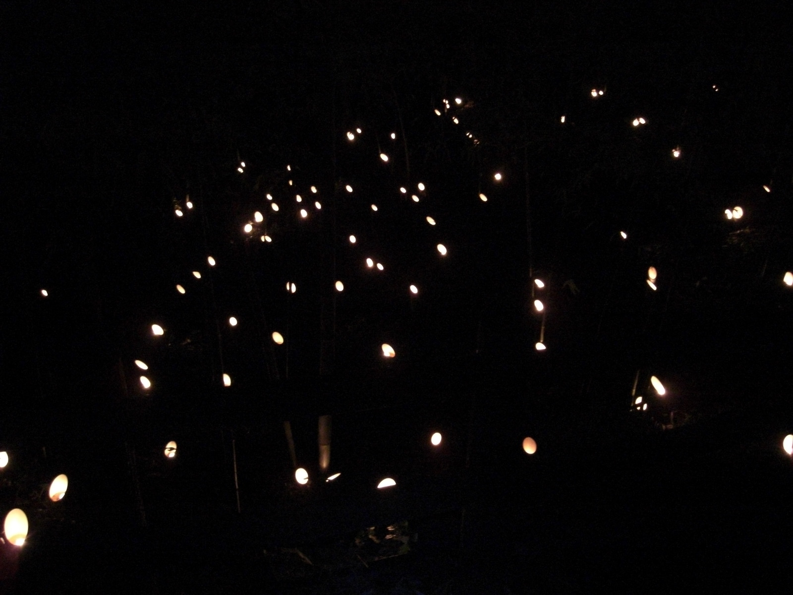 どこからともなく尺八の演奏が聞こえてきます。演奏者はボランティアの2人、竹林の中での演奏です。この生演奏は幽玄の深い味わいを保つことと、暗い中でお客様の渋滞発生を抑えて、順路安全確保のために、目立たぬように頑張っていただいています。この点はご来場の方々のご理解をお願いする次第です。
