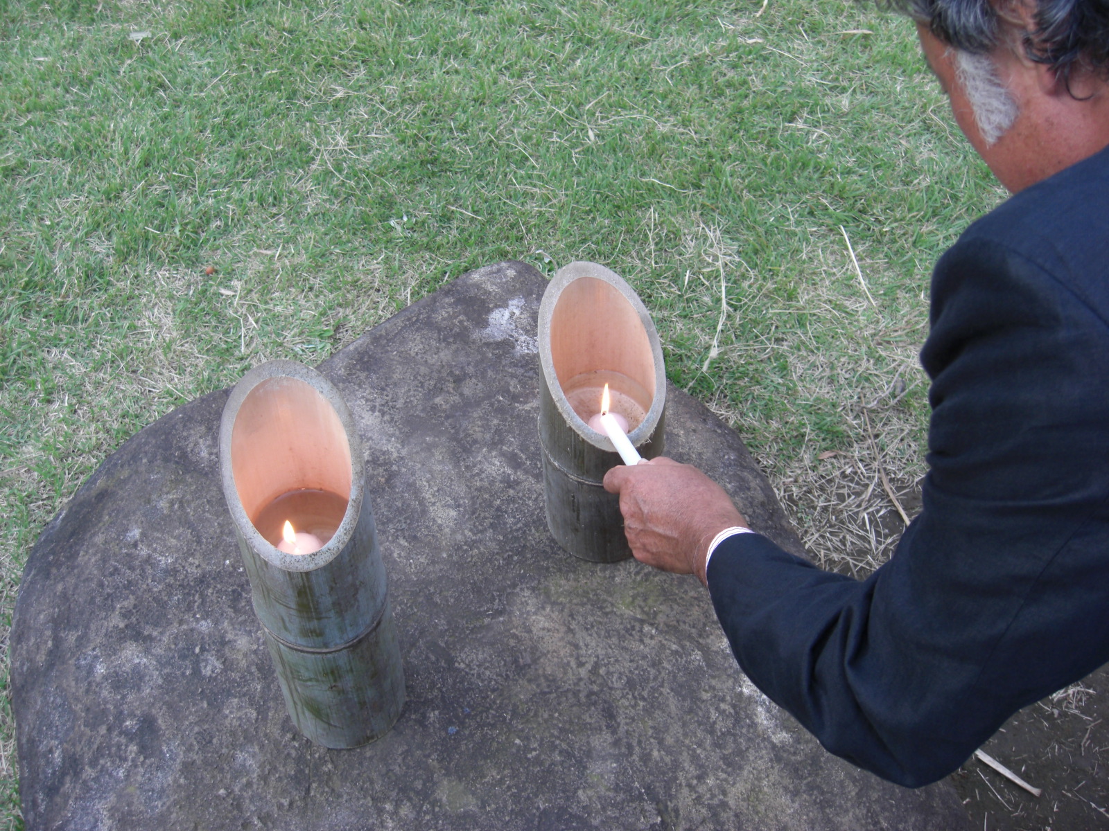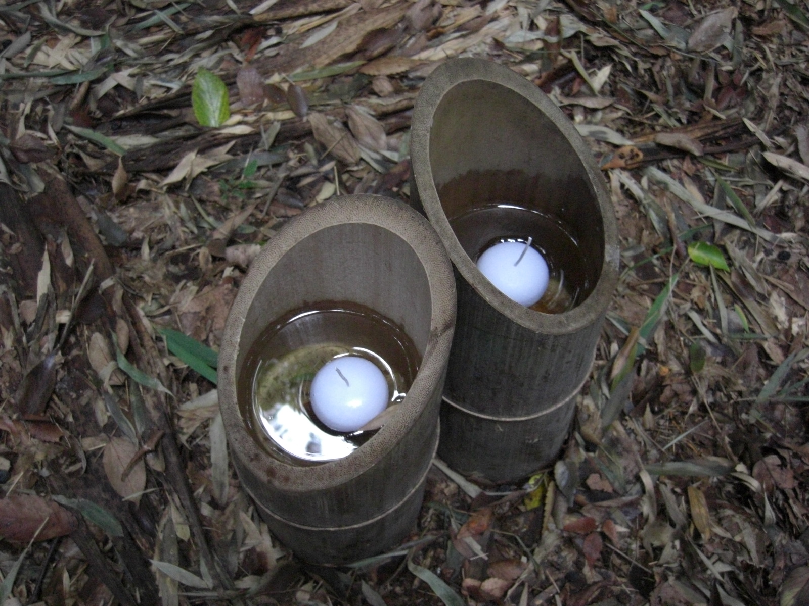 朝から竹灯籠に水を注いで (逆に出すようかな!) ロウソクを浮かべます・・・が、これが大変な作業となります。雨の影響で足元が悪いことが予想されますが、例年のようにお客さんの入場が始まるぎりぎりまで、ロウソクに着火して回るようでしょう。