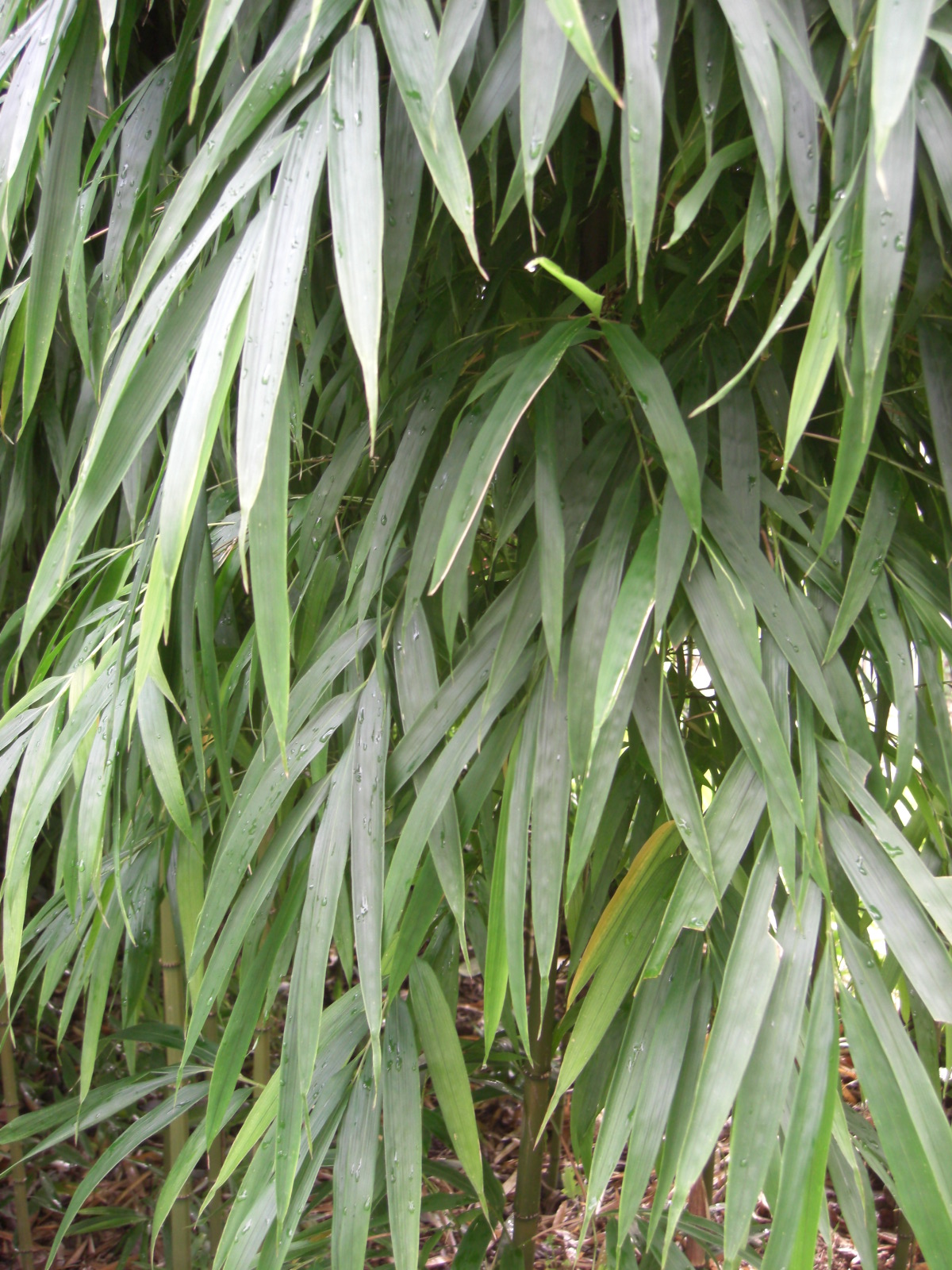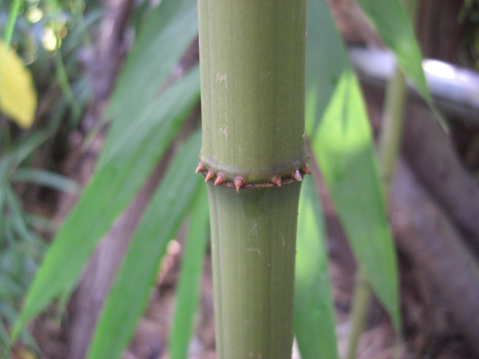 竹稈下部の方の節には触ると痛い突起(気根)が生え、節間はまるで鉄粉を吹き付けたようにざらざらです。葉は細く長く垂れ下がっています。