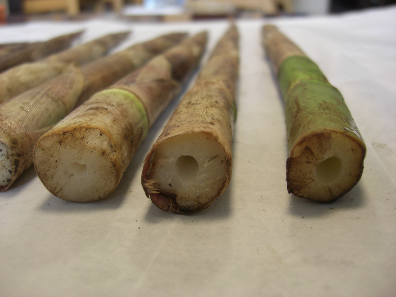 直なモウソウ竹、3〜4年生、6年生以上は不可、地上1mの直径が10cm(Max12cm)、材の仕上げL=6.1m、上端は節の上5cmでカットという具合ですが、今日の金沢自然公園の竹林はその規格のものが少ないので、規格を下げました。