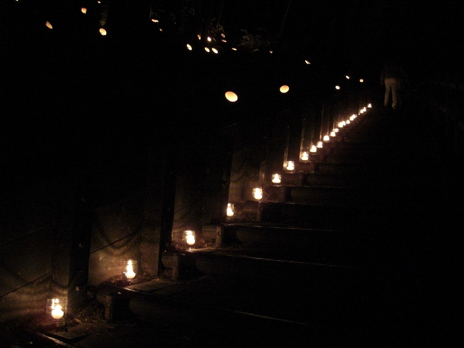 お客様は受付入場すると直ぐに生垣の間から見える小さな灯りと階段を彩るロウソクにワッ・きれいの声。