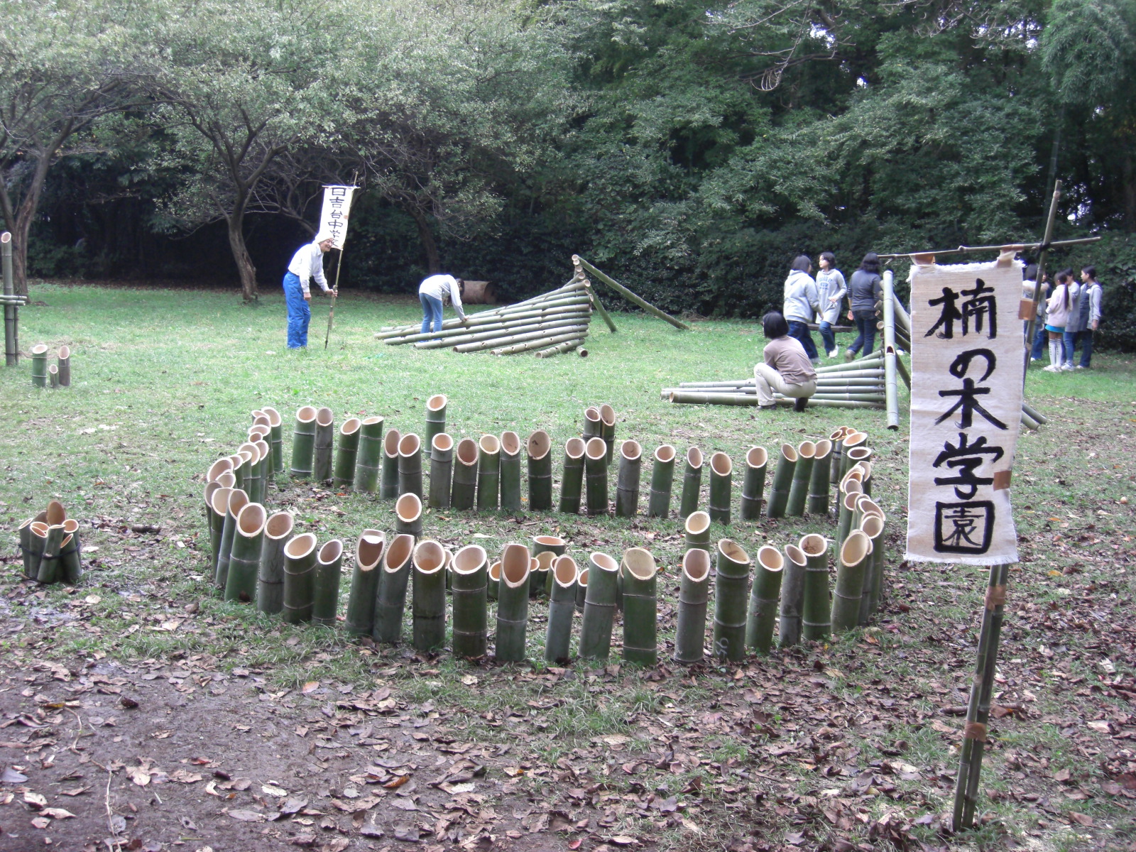 階段を上がった空が開けた場所、二の丸広場入口は、港北区の楠の木学園・城郷中学校・日吉台中学校生徒が朝から頑張った力作、大きな竹オブジェアートがひと際引き立っていました。