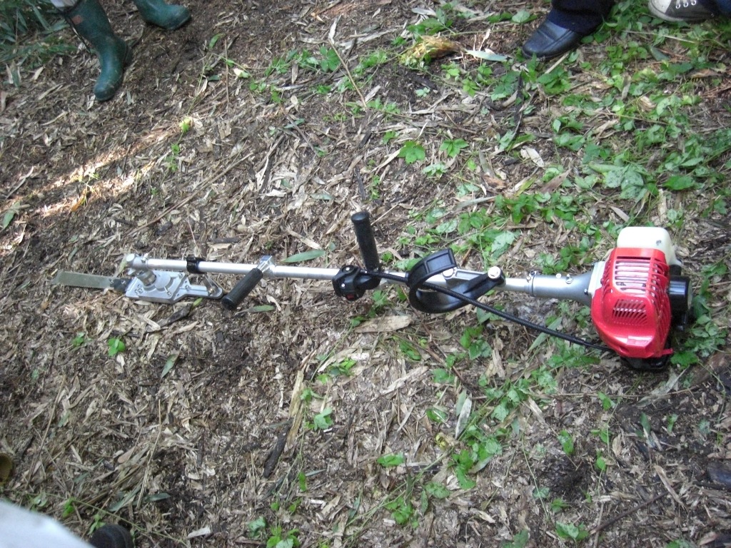 もう1種類は同じかぐやで刈払機シャフトと平行直線的に付いた替刃式機。これは空中に斜めに倒れたままの竹または地上で水平に置かれた竹を切る場合に使える。(ちなみに512は藤井芳行工場長の誕生日だそうです!)