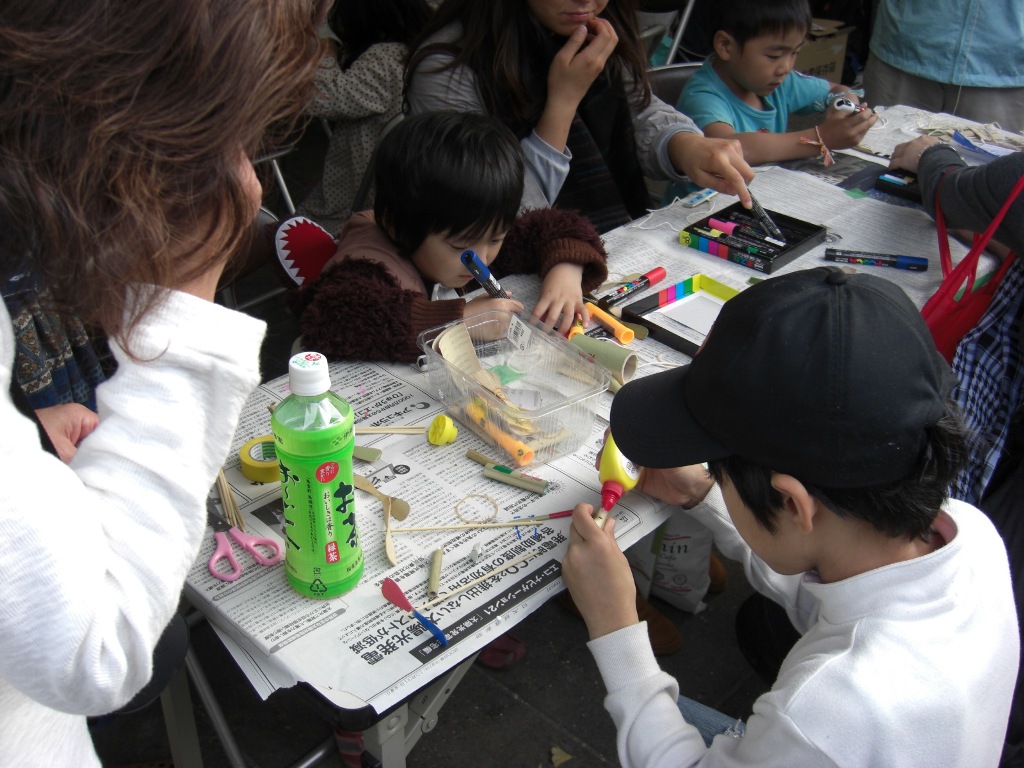 場所によって提供する竹細工のメニューもフレキシブルに変えた方がよさそうです。このような屋外イベントでたくさんのお子さんに喜んでもらえるのは、間違いなくシンプルで色塗りを楽しむぶんぶんコマであることがわかりました。