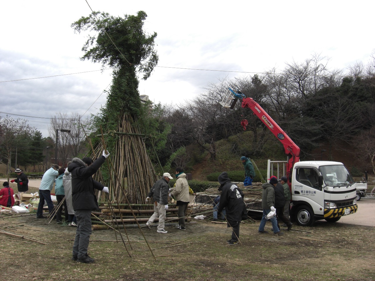この間伐材は年明けの11日に、隣接する山田富士公園で開かれる北山田町内会「どんと焼き」で、当日朝に林浴の庭竹林から伐り出す大きな主柱となるモウソウチクと共に組立てて着火され大きな炎に包まれます。