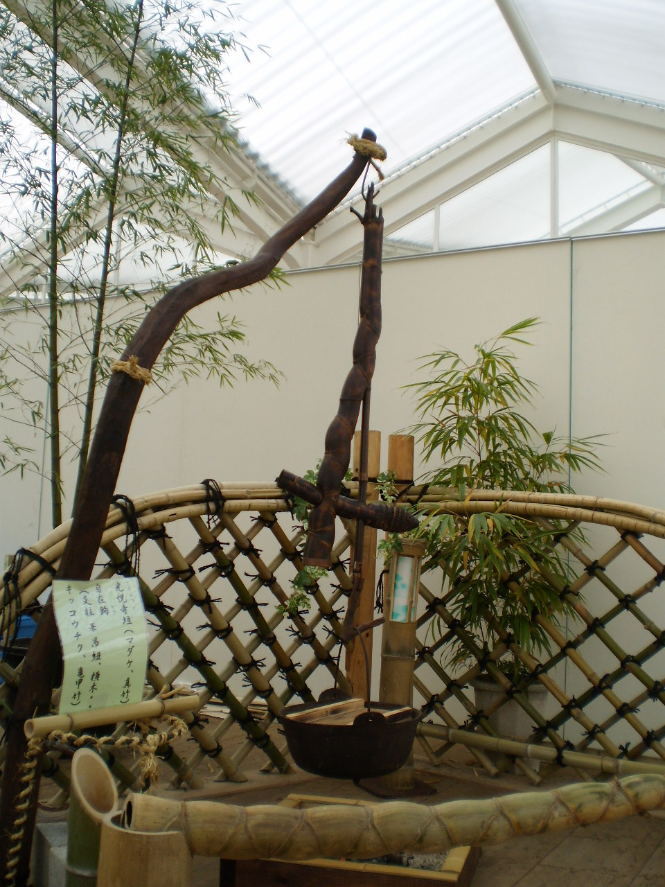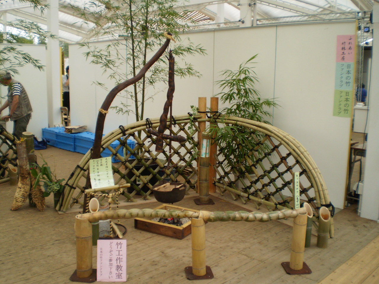 展示コーナーはクラブの活動が分かるパネルと竹の学校「竹垣コース」受講生の作った3基の「光悦寺垣」、キッコウチクで作った「自在鉤(ジザイカギ)」、そして鉢植えのモウソウチク・キッコウチクの配置でとても良い雰囲気でした。