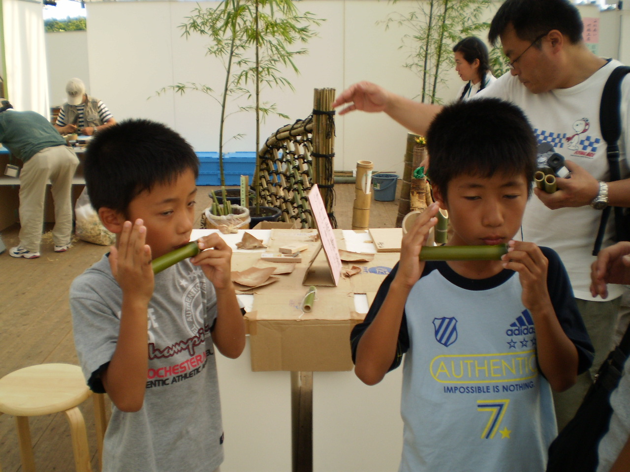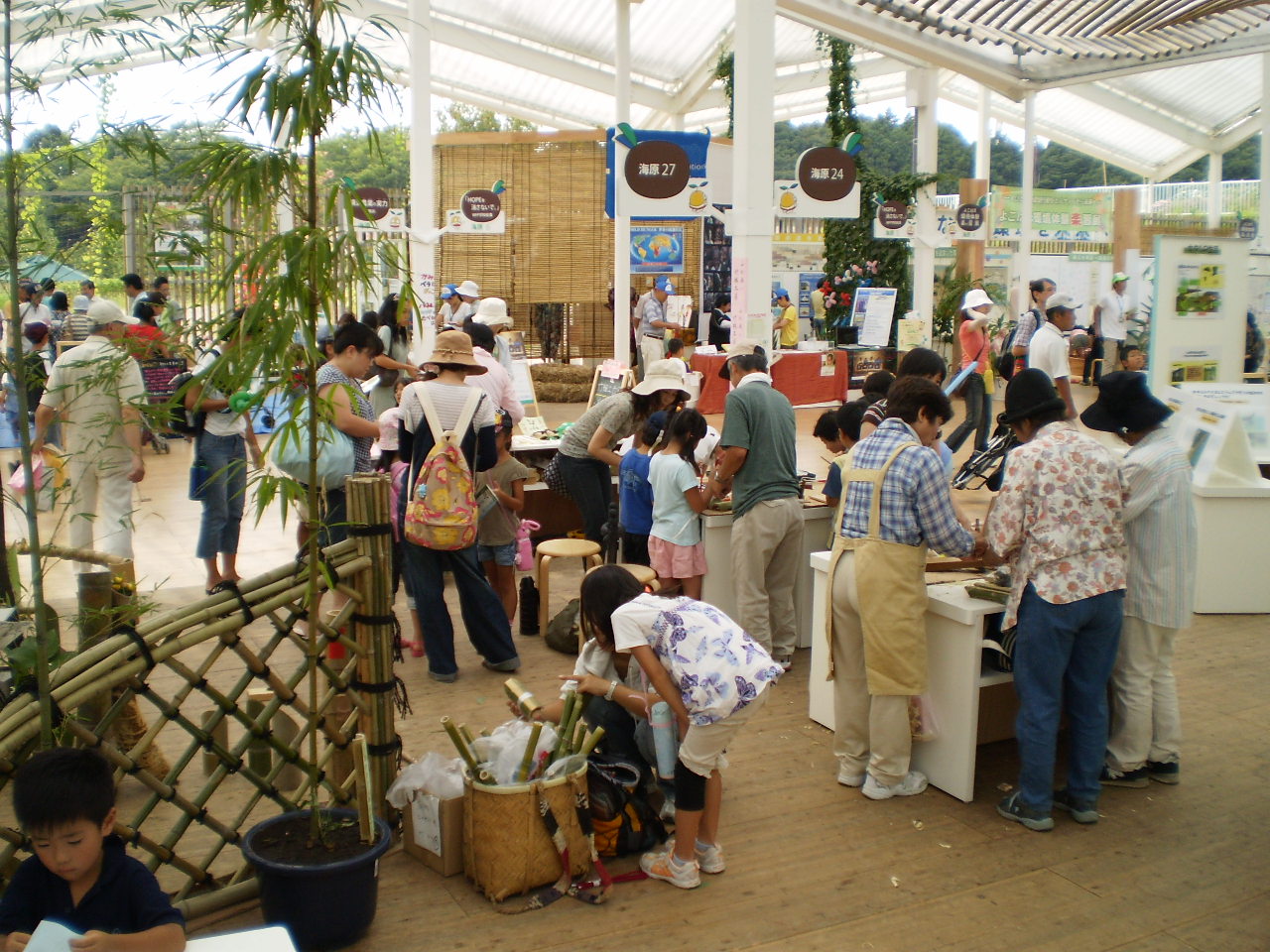 スタッフそれぞれが毎日交代で得意とする竹工作教室を開き、竹笛、ブンブンコマ、竹トンボ作りなどの指導をしました。連日の暑さの中、会場は幕屋根があるものの熱がこもっていてみんな大変でした。そんな状況で入場者数も計画より大幅に少ないようですが、日本の竹ファンクラブのブースには沢山の来場がありました。