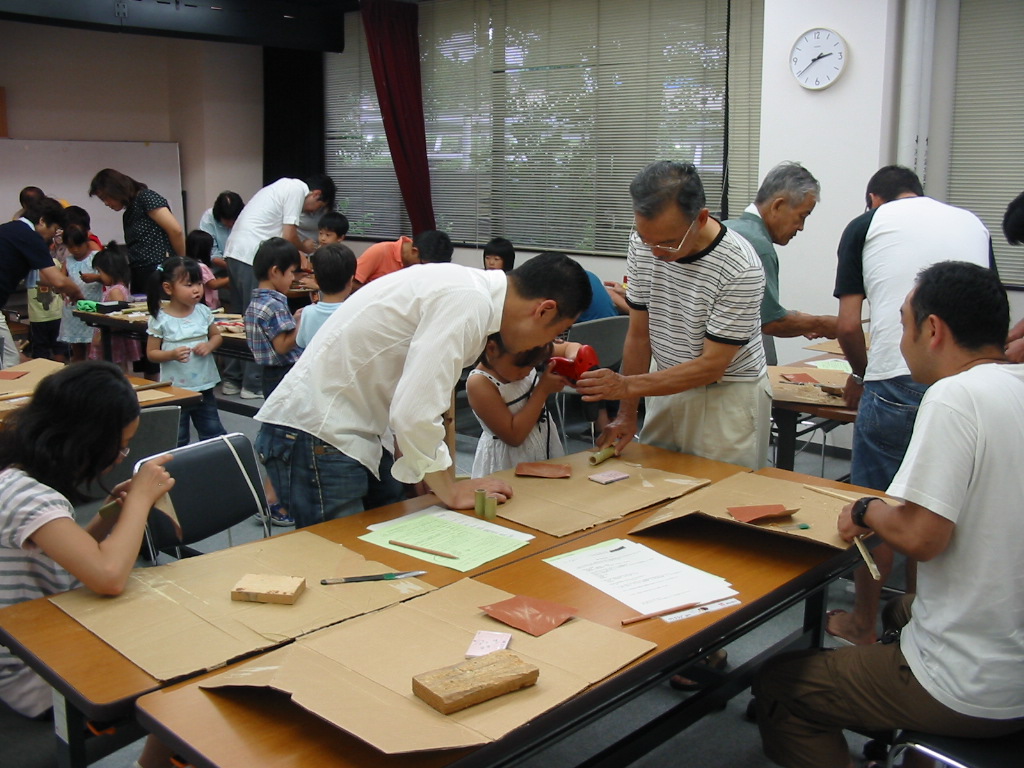 夏休みも残り少なくなった一日、あざみ野駅際の横浜市山内図書館で竹工作教室を開きました。先生は女性2人男性1人とほかに助手役が私ともう一人。