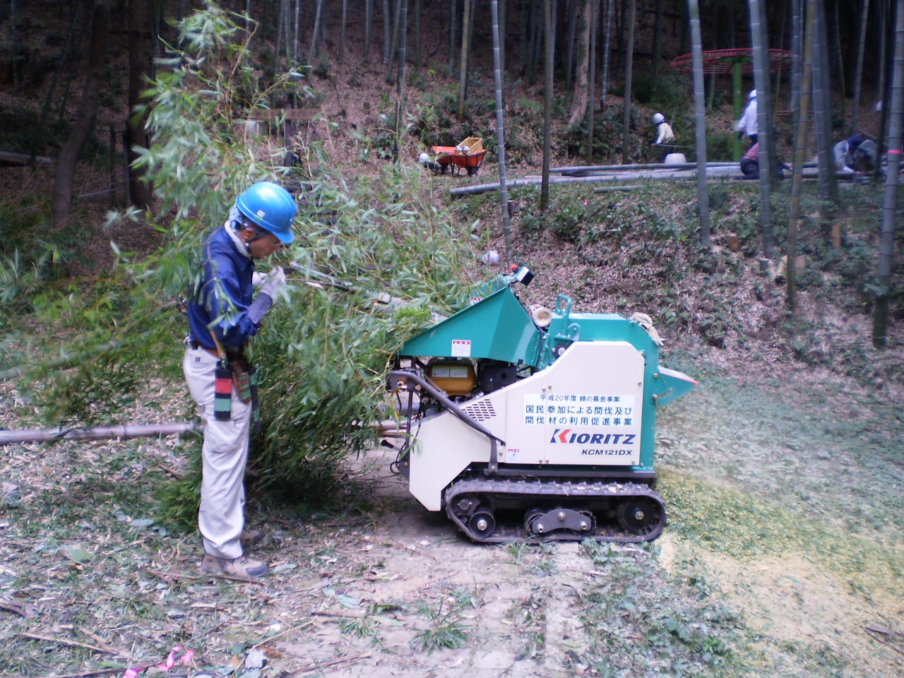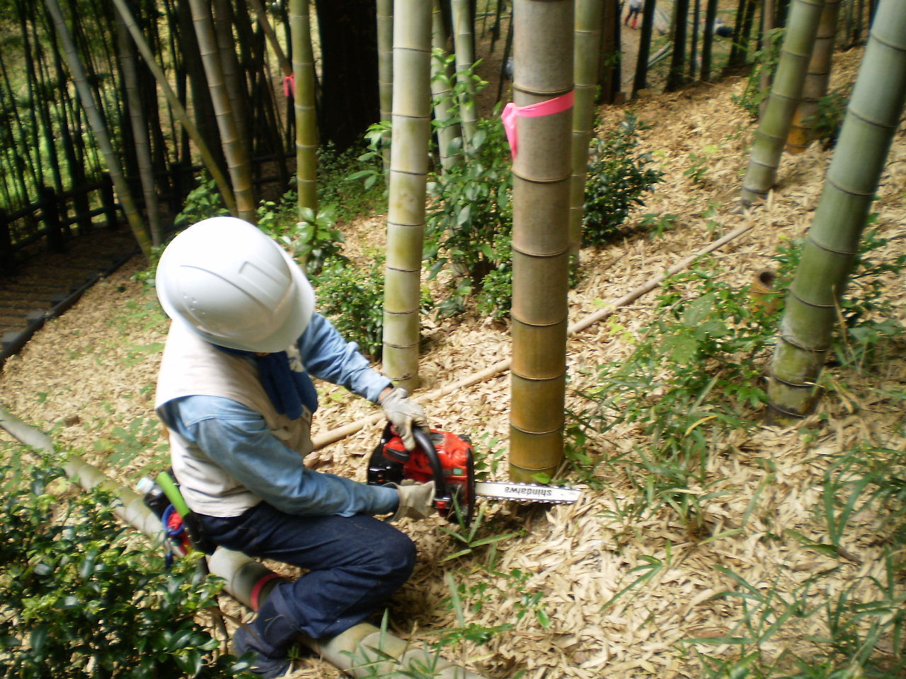 竹灯籠まつりに向けた3日目の整備作業は、間伐班、チッパー処理班、竹灯籠製作班に分かれて竹取協力隊・ボランティアがあずま屋エリア、中央休憩所エリアに分かれての作業となりました。ヘルメットと耳栓着装の完全武装で丸ノコ、チッパー、チェンソーの音が響き渡りました。クラブの大型丸ノコは1台が開国博ヒルサイドに出張中、修理が終わって今朝届いたのを含めて3台が大きな金属音をたてて、竹灯籠が次々と出来ました。年々増加するお客様の感嘆の声と喜びの顔を想いつつ、また楽しみつつ気合をいれた日がもう少しつづきます。