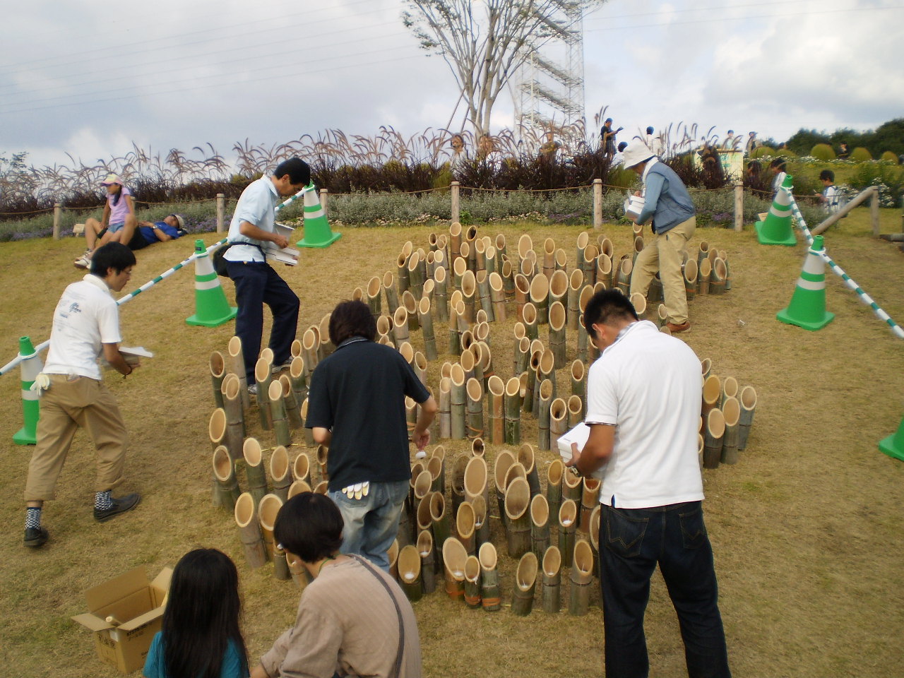 横浜国際プールの準備作業写真です(間伐〜竹灯籠製作〜設置〜水注入〜ロウソク入れ〜着火)