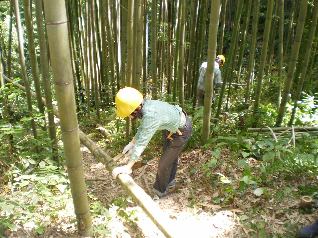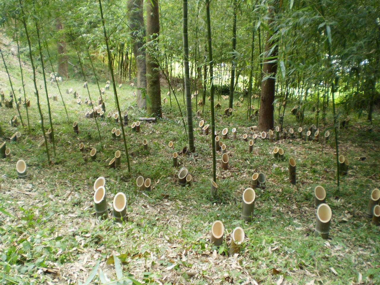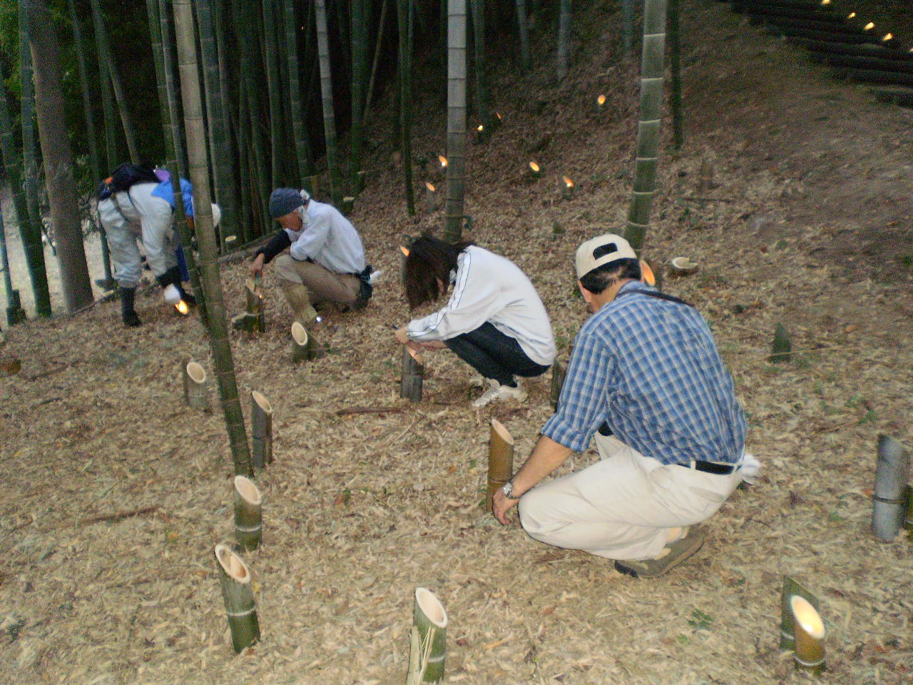 9月12日から25日までの間、延べ9日間約120名の参加で竹の間伐、竹灯籠材以外のチッパーかけ、竹灯籠製作、設置と続きましたが着手初日に雨に降られ、それでも倉庫に貯め置きした竹で竹灯籠を製作してしのぎました。