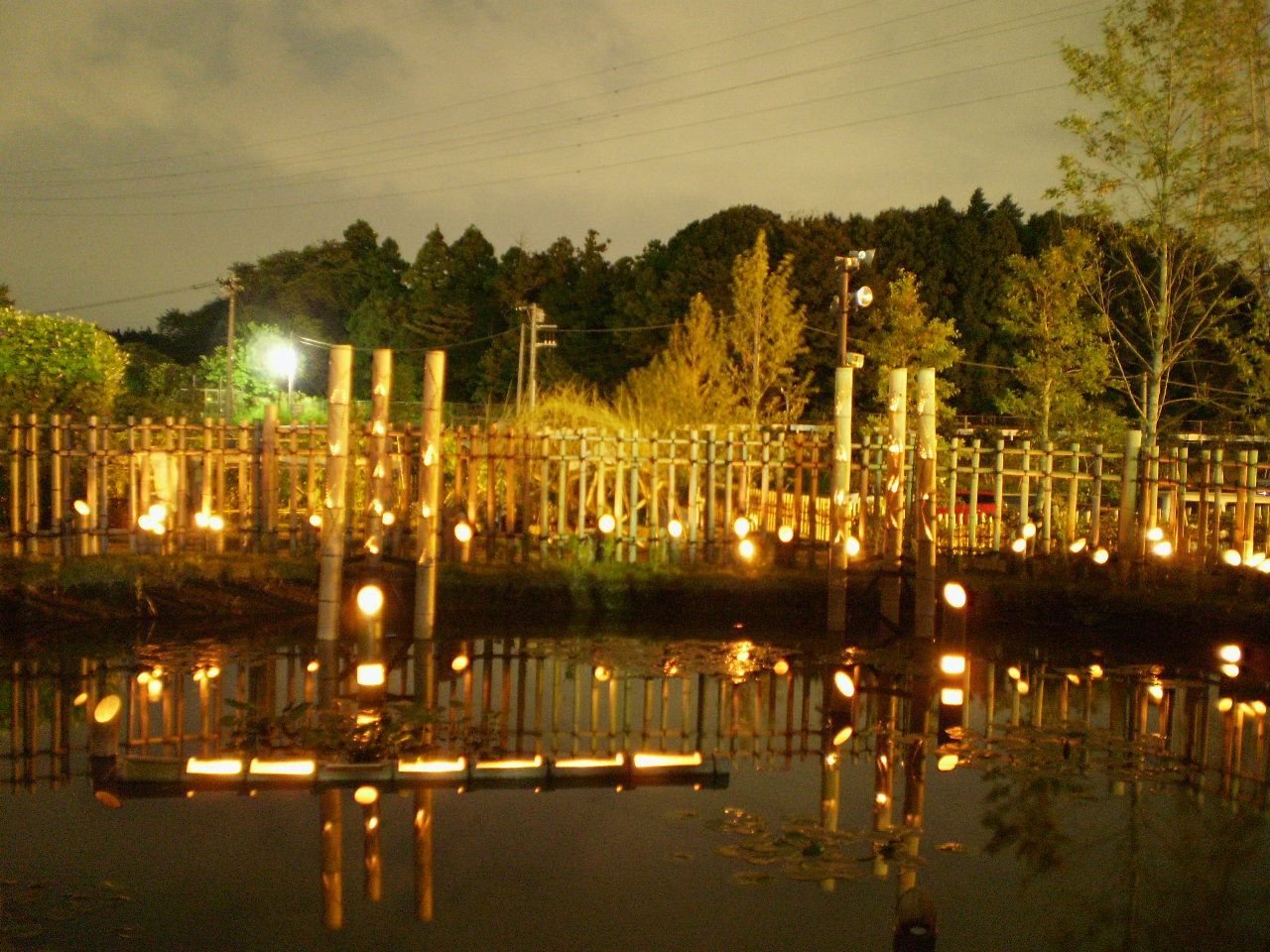 第4回目となった竹灯籠まつり会場はまさに幽玄の世界、会場全体は静けさの中、秋の虫の声が聞こえる素晴らしさで、水に浮かび灯されたロウソクが竹の内側をほのかに照らし、あちらこちらからため息さえ聞こえてきました。日々の喧騒を忘れて心安らぐ時間を皆さんゆったりと回って味わっているようです。