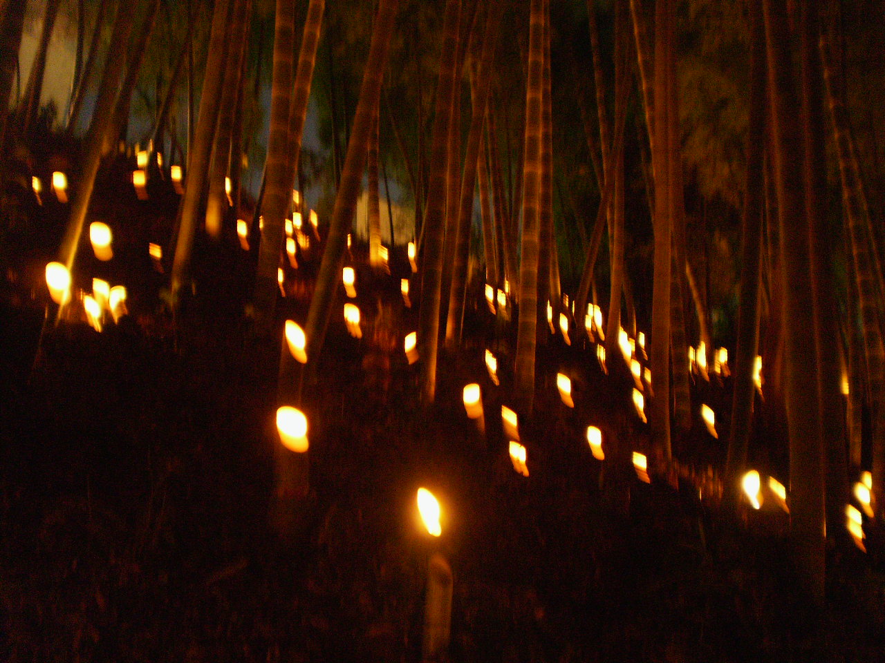 開国博Y150ヒルサイドエリアの竹の海原会場で、閉幕に近い9月21日から25日まで、会場内の棚田・池をはじめ4か所で竹灯籠が灯されました。