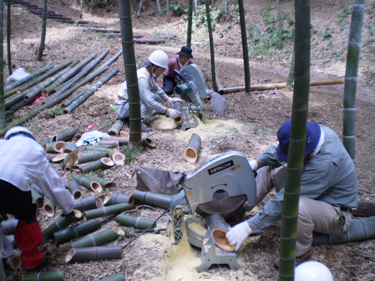 暑い夏が終わり朝晩めっきりと涼しくなって、いよいよ秋の間伐シーズン到来です。適正に間伐した竹は竹灯籠を作るのに相当な数を必要とします。横浜国際プール林浴の庭の竹林は5年サイクル整備にのっとって、5年前に出た竹の間伐を始めました。伐り出した竹は9月26日、秋の夜の幽玄の世界「竹灯籠祭り」に使います。