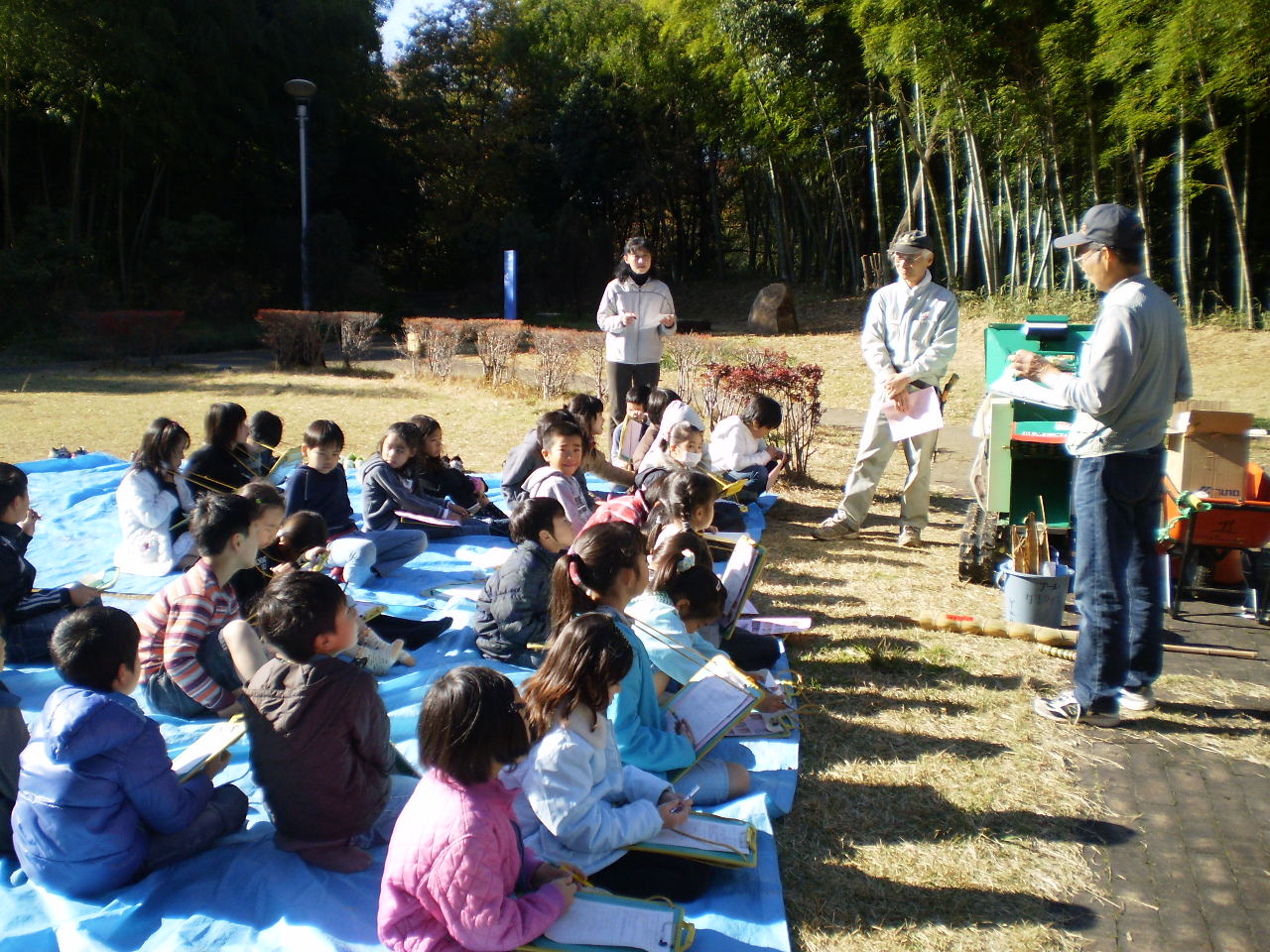 園路での見学時も、瞑想の庭でもみんな熱心にノートをとり、しかも我々のイベントに参加したことのある生徒がたくさんいるとなれば大サービス。チッパー機の大きなエンジン音を聞いてもらい、お土産に渡した竹笛を吹いてもらい、タケぽっくり歩きを体験してもらって最後に全員からお礼の言葉をもらい、さらにブンブンコマは学校に戻って、みんなで糸を通してねと先生に全部渡して授業を終了。